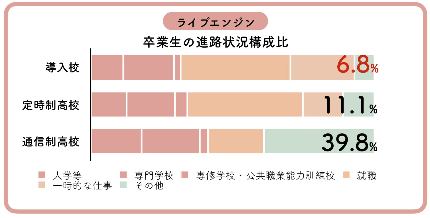 つながる場をつくるプログラム「クレッシェンド」と進路相談室「ライブラボ」を導入した高校では、卒業生の進路未決定率が6.8%、全国の定時制高校・通信制高校に比べて低いという成果を出すことができました。ある高校では就職率を13%上げることができました。