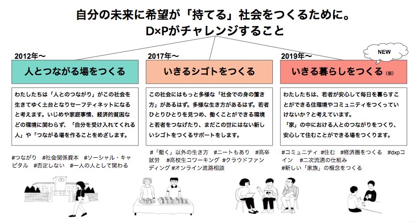 これからD×Pでは、ひとりひとりの若者が希望がもてる社会をつくるため「若者支援コミュニティ」をつくります。