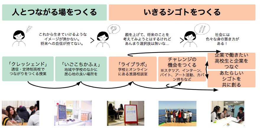 D×Pでは、創業当初から「つながる場」をつくるために通信・定時制高校の中で授業をするプログラム「クレッシェンド」を行ってきました。