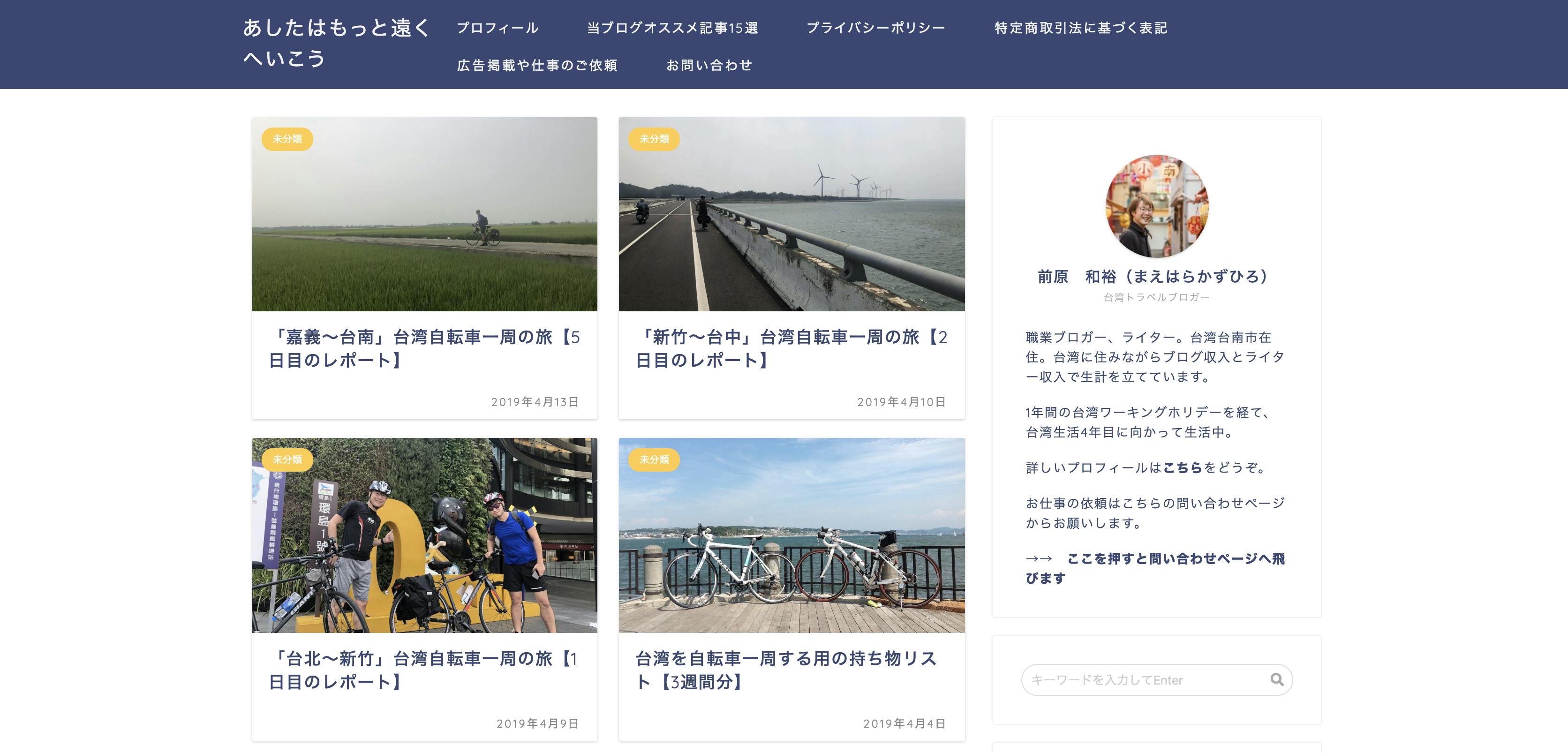 ふだんは台湾の台南でブログを書いて生活をしています。「あしたはもっと遠くへいこう」という台湾観光ブログを6年間ほど運営してきました。
