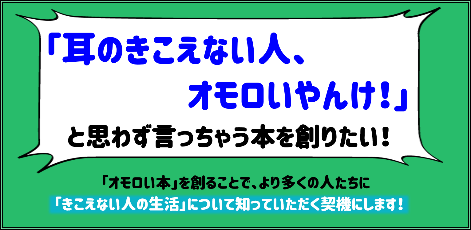 そんな心のバリアを少しでも壊せるように、「きこえない人の生活」についてオモロく、ププッと笑って理解していただけるような本を創るための資金を募ります。