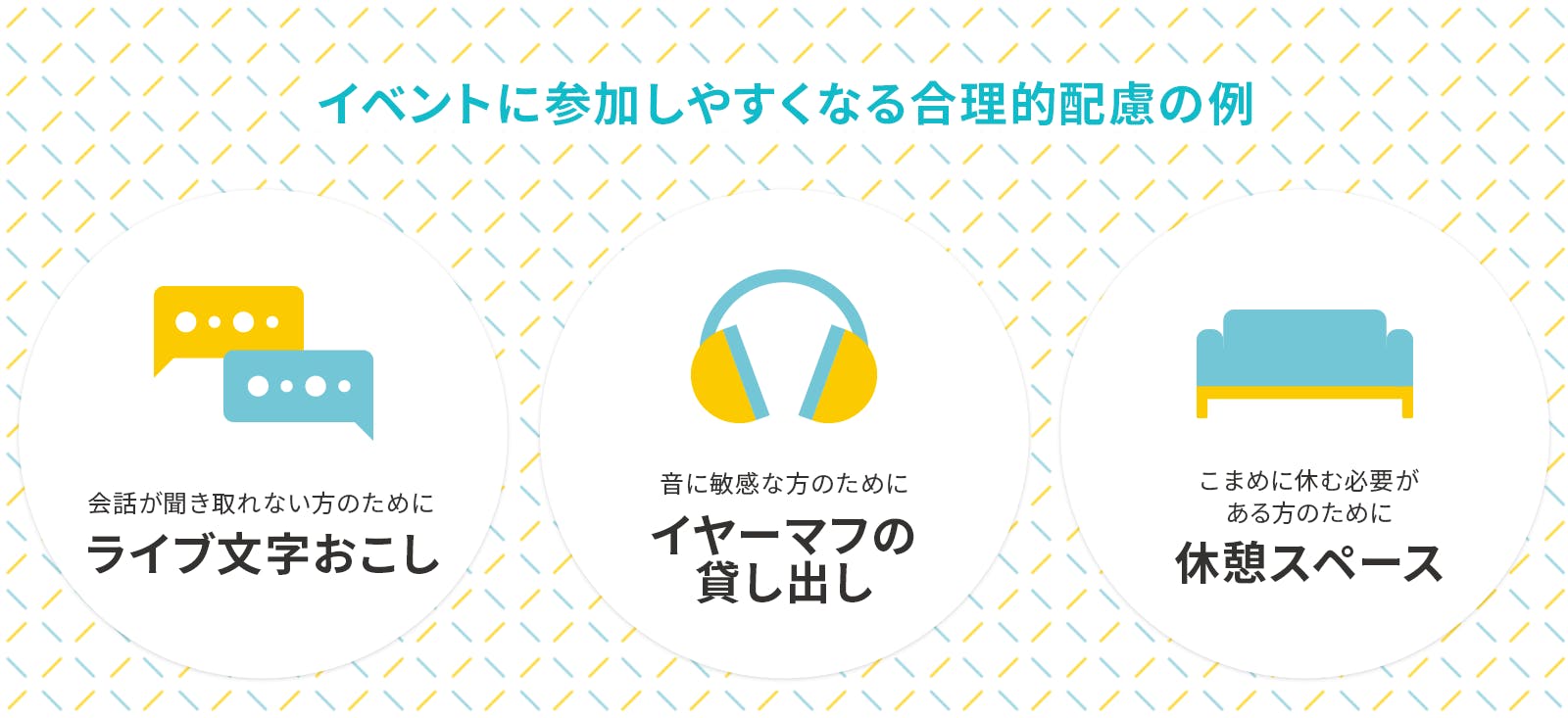 また、さまざまな障害・疾患がある方の特性を踏まえた「合理的配慮」を実施しているイベントや勉強会はほとんどありません。