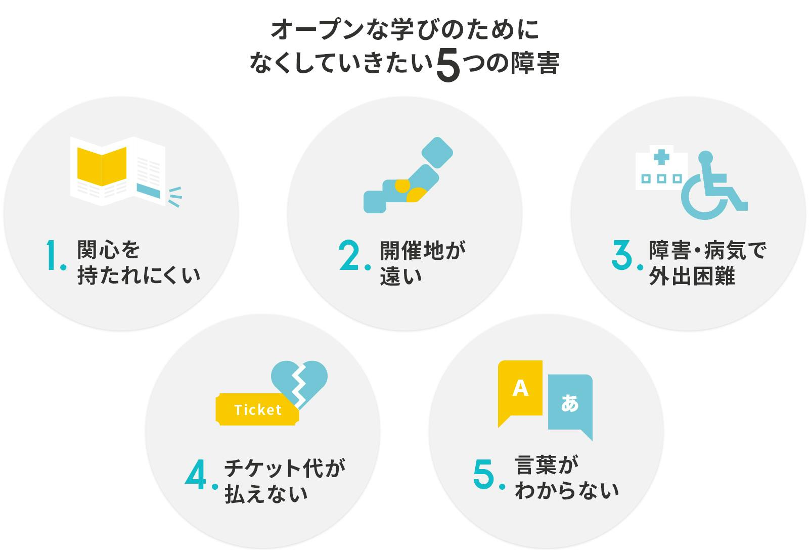 社会的マイノリティ当事者の方をはじめ、さまざまな状況にある人がOPEN LABの知にアクセスできるように、私たちは以下の5つの障害に対応する環境整備を実施することを約束します。