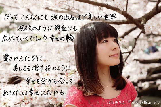 2017/04/20 21:43ついに、皆さまからのご支援のおかげで完成させることのできました新曲『幸せの輪』の無料ダウンロード配布をスタートいたしました! 下記リンク先にてどなたでも無料でダウンロードできます。 http://bit.ly/2nvUupn クラウドファンディングを通じてたくさんのご支援・応援を頂いたおかげで、素晴らしいアーティストの方々に制作参加していただき、無料ダウンロードを実現することができました。 自分にとって本当に大切な一曲なのでこのような形で発表することができて、とても嬉しいです。心より感謝申し上げます。 これからも、皆さんから受け取った応援の気持ちを、優しい歌に代えて歌い続けていきたいと思います。 ***** 『幸せの輪』詞曲 : はたゆりこ編曲 : 高野 健一バイオリン演奏/ストリングスアレンジ : Songil Choiピアノ : 山本 佳祐 ***** 青空に揺れる桜が 雪のように惜しみなく降り注ぐから 思わず立ち止まる人たちに 笑顔 咲かせてく シャッター切る指先に祈りを込めて 電波に乗せて届けよう 落ち込んで見えたあの人や ひとりきり泣いている人の元へ 誰もが涙に代えてまでも守りたいものがある 私は私を諦めないの 見えない想いに生かされているから だってこんなにも涙の出るほど美しい世界 一瞬の命だとしても私らしく精一杯生きる 愛されるたびに美しさを増す花のように 優しさに触れるたび私はもっと強くなれる 南から北へと風に乗せて 桜は希望の香り運ぶ たとえ誰が見ていなくても 美しく生命を踊るだけ 誰もが眩しく見えて 自分の 無力さばかり目についても どうか焦らないで あなただからこそ救える心がある だってこんなにも涙の出るほど美しい世界 波紋のように幾重にも 広がっていくでしょう 幸せの輪 愛されるたびに美しさを増す花のように 幸せを分かち合って あなたは幸せになれる だってこんなにも涙の出るほど美しい世界 一瞬の命だとしても 私らしく精一杯生きる 愛されるたびに美しさを増す花のように 優しさに触れるたびもっと強くなれるから 同じ空の下 頑張っているあなたへ この心 届きますように... はたゆりこ もっと見る