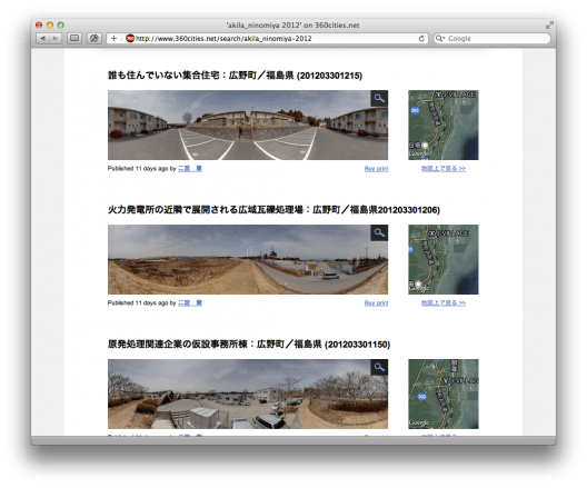 2012/06/17 02:26皆様、大変永らくお待たせ致しました。 実は去る6月1日に、 本プロジェクトによって撮影されたパノラマ画像を、 やっと公開することが出来ました。 ご報告が遅れましたことを、 まずはお詫び申し上げます。 コンテンツは合計でちょうど300点。 当初より大幅に少ない数ではありますが、 各地点での撮影点数と、 それを横断的に見ることが出来る、 非常に貴重な資料になったのではないかと思います。 現在は、360citiesという、 世界最大のパノラマVRポータルサイトに上がっております。 下記URLで全てご覧いただけますので、 ぜひアクセスして下さい。 http://www.360cities.net/search/akila_ninomiya-2012 実は今、日本に居ません。 次の活動報告で詳しくお話します。 帰京は6月21日を予定しています。 そこから次は、リターンの制作に入る予定です。 どうぞよろしく御願い申し上げます。 もっと見る