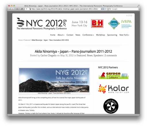 2012/06/17 02:40引き続き、もう一つの活動報告を行います。 本プロジェクトの一区切りがパノラマの完成と公開にあるとしたら、 その後で、講演などによって周知していただくことも、 非常に大切な活動だと、私は思っています。 昨年は4月1日に「Japan-Pano-Journalism」が公開されてから、 すぐに関係個所にコンタクトを取り、 多くの講演会で喋らせて頂きました。 今年はタイミング的にも、良い講演会が無く、 どうしようかと思っておりました。 そこに、 私が加盟しているパノラマクリエイター/フォトグラファーの国際団体、 「IVRPA(International VR Photography Association」の年次総会が、 ニューヨークはマンハッタンのど真ん中で、 6月13日から16日まで開催されるということを知り、 まさにこの場で講演を行い、 特に意識の高い、 100名近い世界中のトップパノラマフォトグラファーの前で、 昨年の活動の報告と御礼も兼ねて講演を行い、 被災地への継続支援を訴えられたら、と思い立ちました。 講演詳細は、下記サイトでご覧いただけます。 ・Akila Ninomiya – Japan – Pano-Journalism 2011-2012 | NYC 2012 - The International Panoramic Photography Conference http://www.nyc2012.org/2012/05/akila-ninomiya-japan-pano-journalism-2011-2012/ そして、去る6月13日、私は初日の3番目という、 場にまだ緊張感が漂う中で、 本プロジェクトの経緯や想い、 そして今後の展開についてお話してきました。 講演は全て英語で行われましたので、 英語が苦手な私は、 多くの方々の支援でスピーチ文を英語で起こして頂き、 当日はそれを45分間、読み上げるだけという形式になってしまいましたが、 聴講された皆様には、大きく感心をいただけました。 そして本日、まさに本会の最終日でした。 残る1つのプログラムの前のランチタイムに、 たまたまネットが使える環境に恵まれましたので、 こうして活動報告をさせていただいている次第です。 6月21日に帰京する予定です。 その後は、リターンの制作に入りたいと思います。 パトロンの皆様には、その旨のメールを改めてお送り致します。 引き続き、よろしくお願い致します。 もっと見る