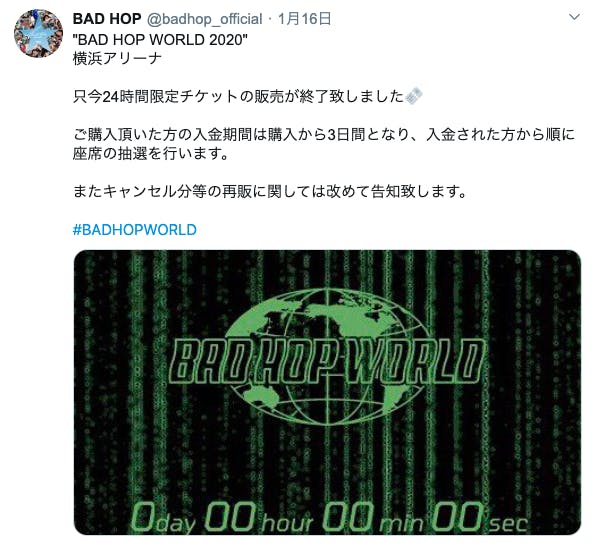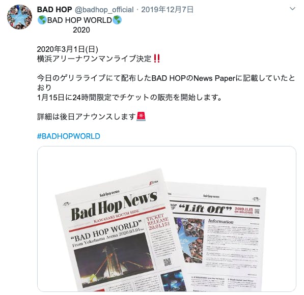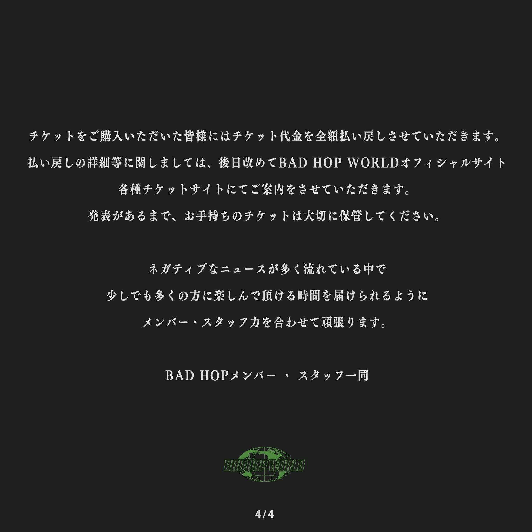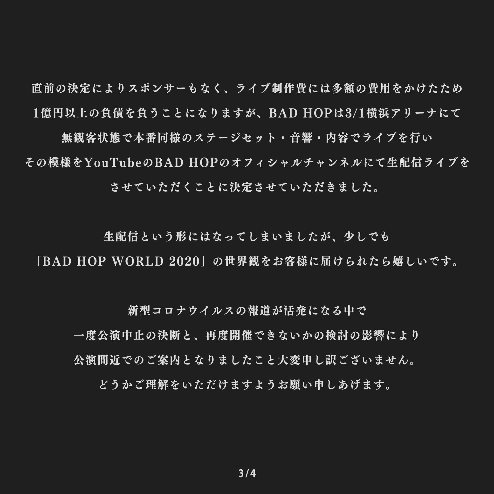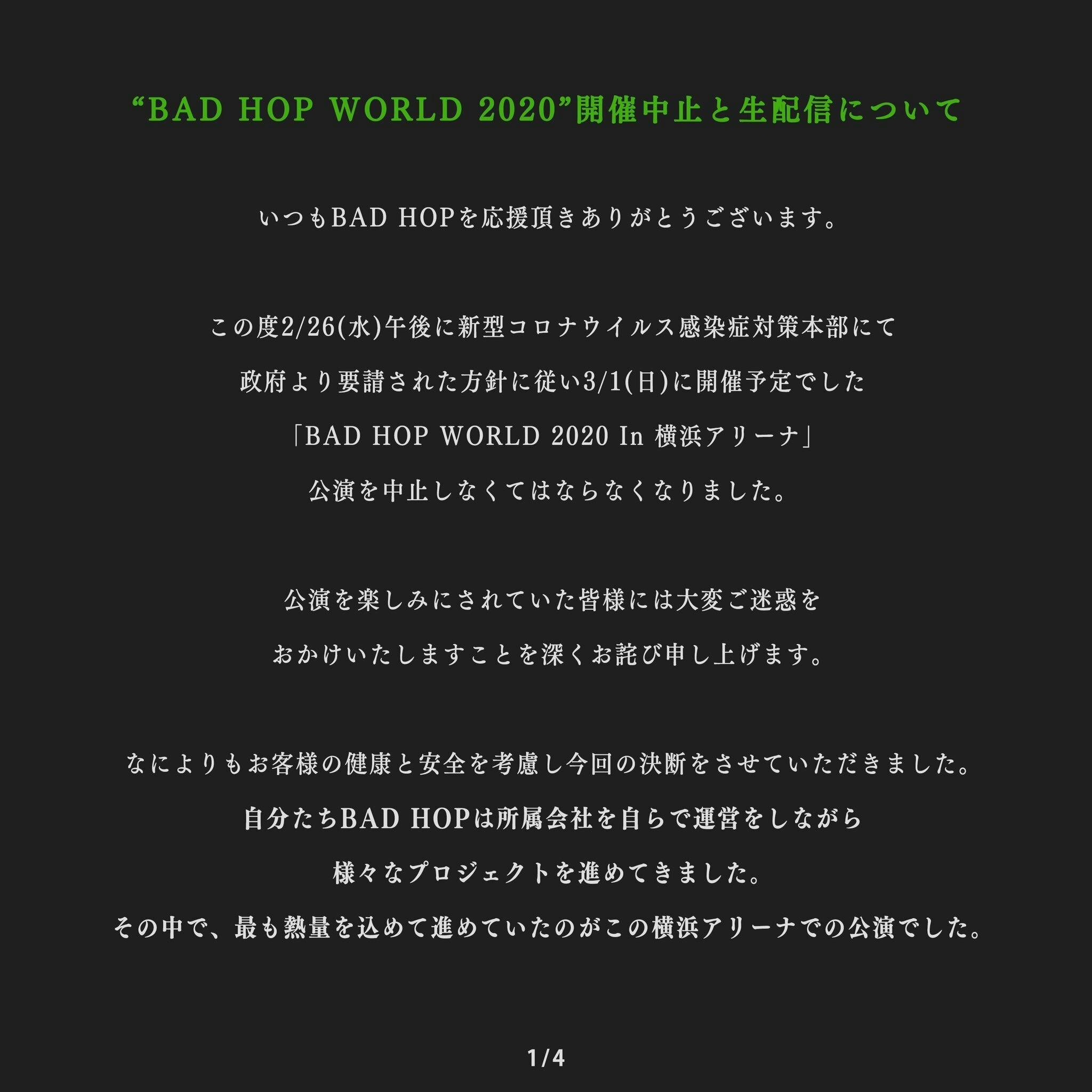 先日私たちは、3/1 横浜アリーナにて開催を予定しておりました「BAD HOP WORLD 2020」を昨今の情勢を考慮した結果止むを得ず公演を中止することにしました。