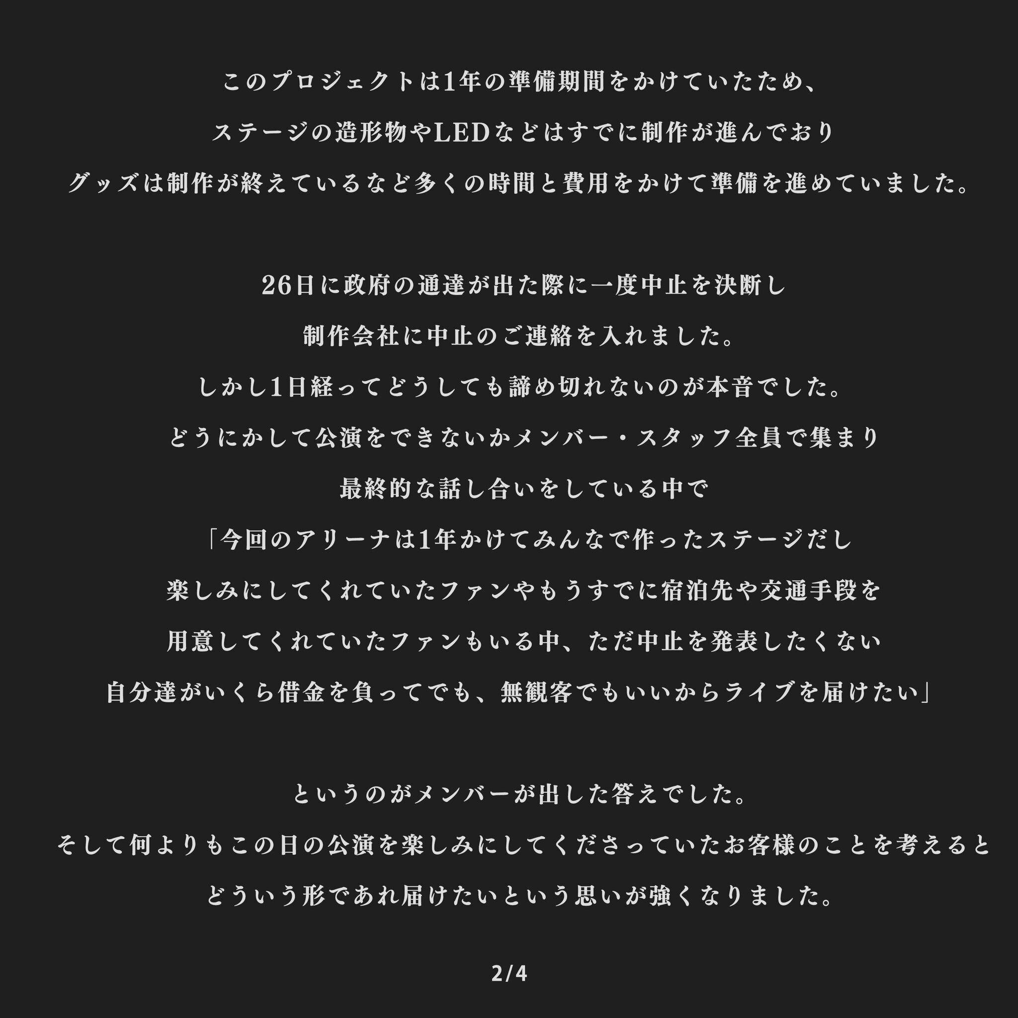 でも、この日の為に最高のクオリティで準備してきたメンバー、クルー、そして支えてくれたスタッフ達、何より3/1を楽しみにしてくれたみんなに『2020/3/1横浜アリーナ』という一度しかないステージをどうしても諦め切れませんでした。