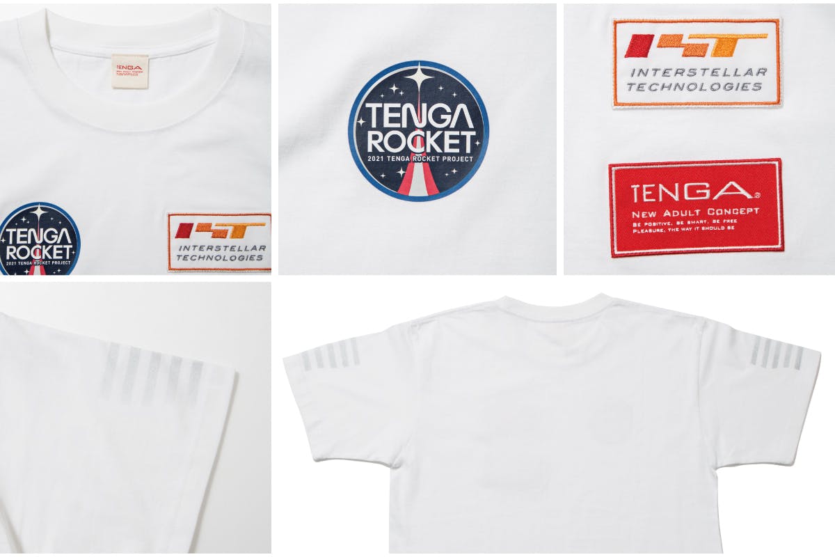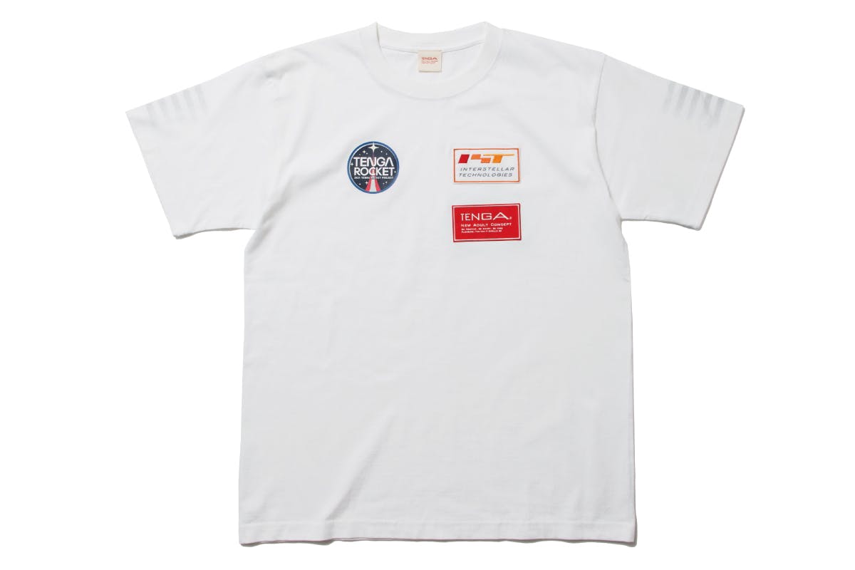 「TENGA宇宙隊員Tシャツ」は、胸に隊員の証であるTENGAロケットプロジェクトのオフィシャルロゴと、インターステラテクノロジズとTENGAのロゴワッペンがあしらわれ、両袖にグラデーションでシルバーの5本ラインがプリントされた、このプロジェクト限定の特別なTシャツです。TENGA宇宙隊員になって、一緒に宇宙を目指しましょう!