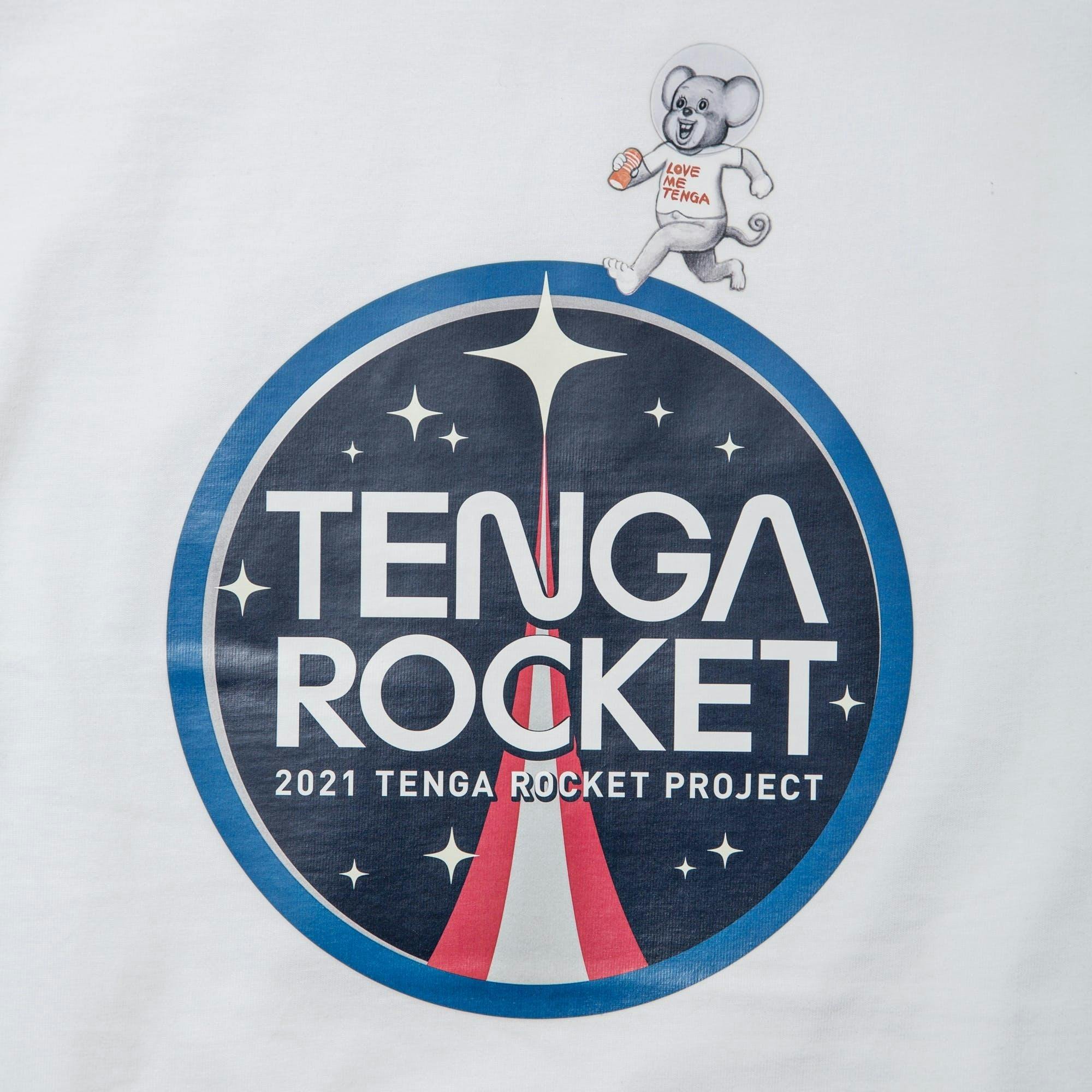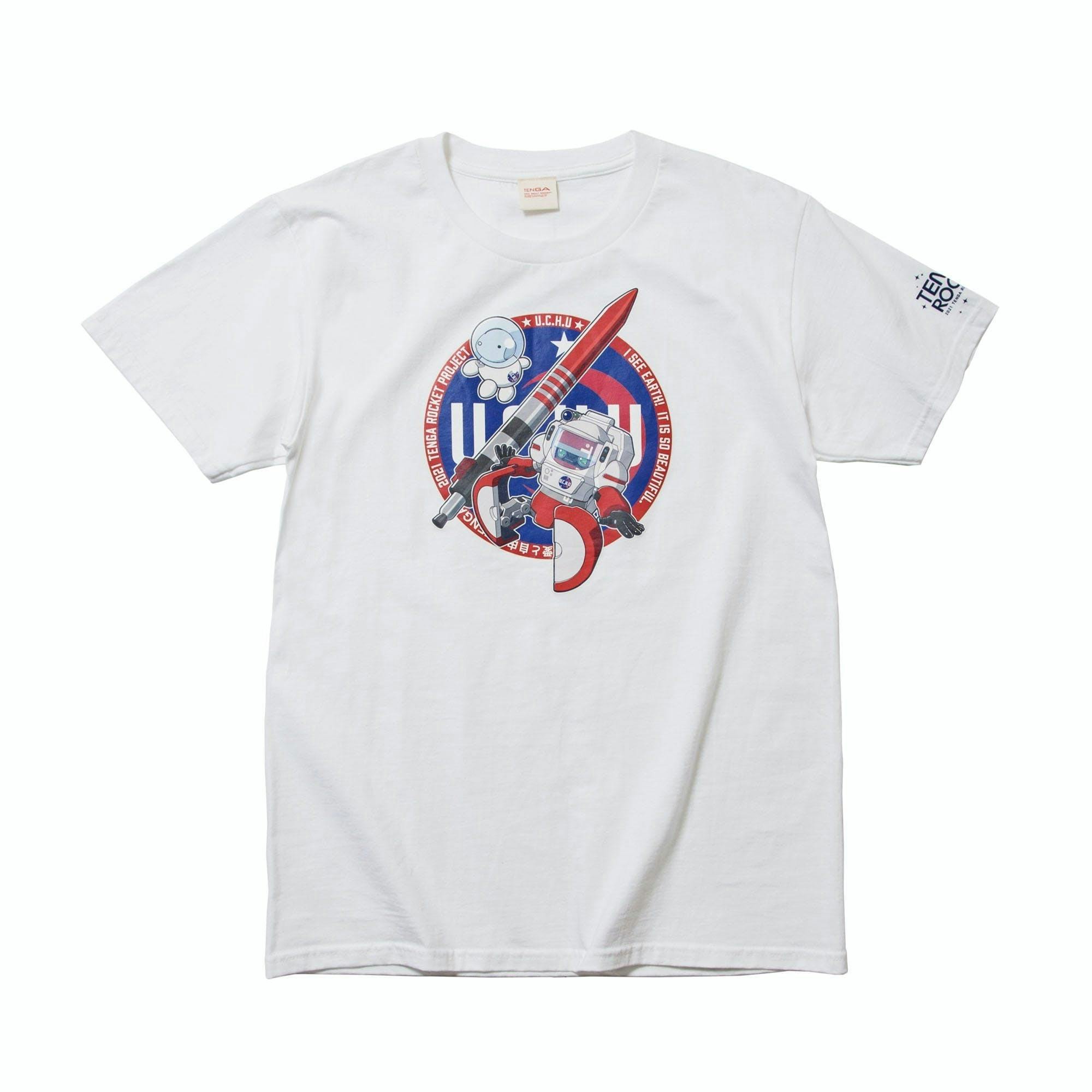 TENGAロケットから宇宙空間へ飛び出したTENGAロボとEGG DOGをポップにイラスト化。背景にオリジナルの「U.C.H.U(宇宙)」のロゴマークを配置、左袖にはROCKET PROJECTのロゴがプリントされています。みなさま、TENGAロボの活躍に乞うご期待ください!