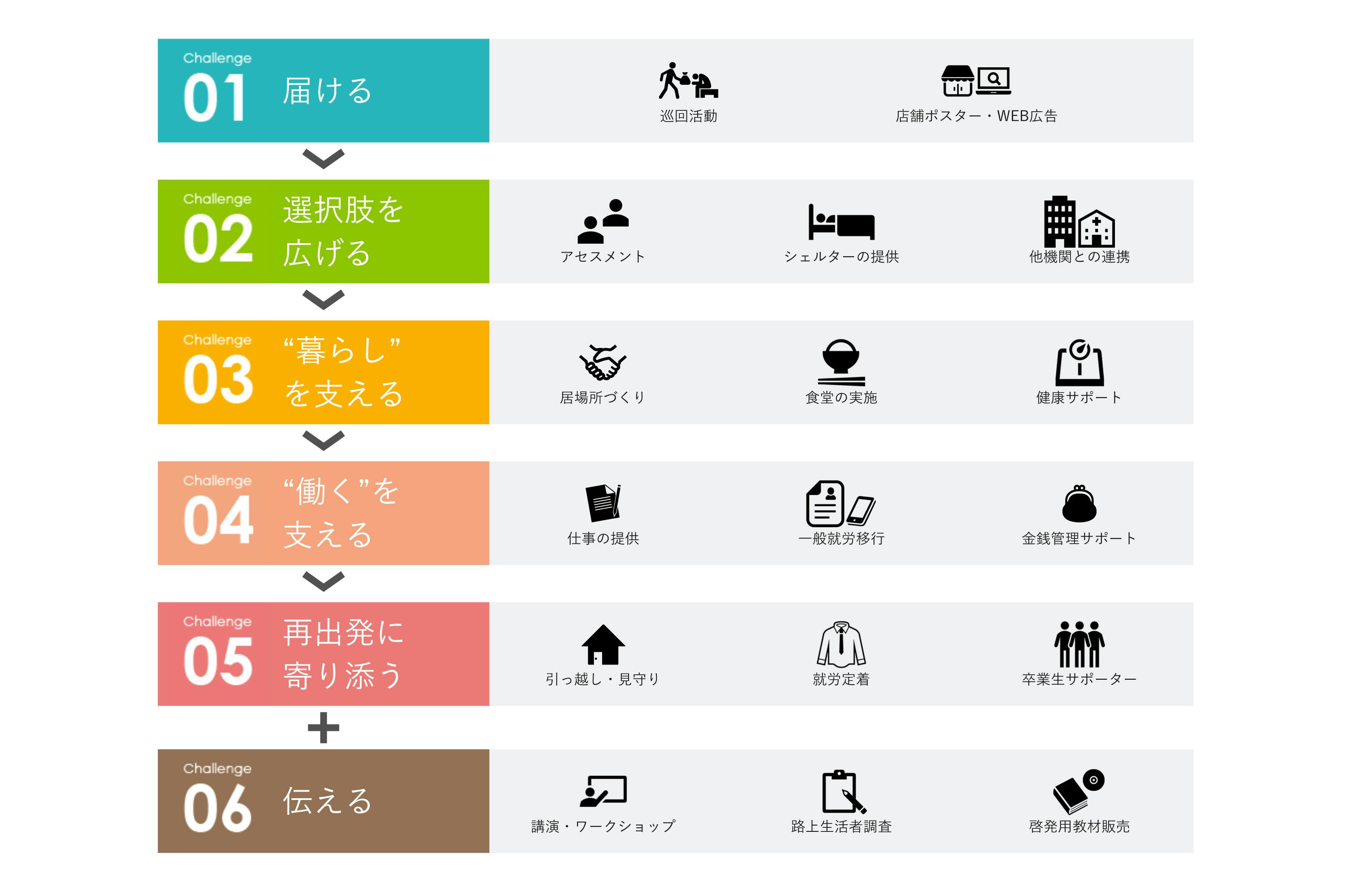 私たちはホームレス状態から抜け出したいと思っても抜け出せない状況や、偏見がなくならない状況を、一連の支援活動「6つのチャレンジ」で解決してきました。