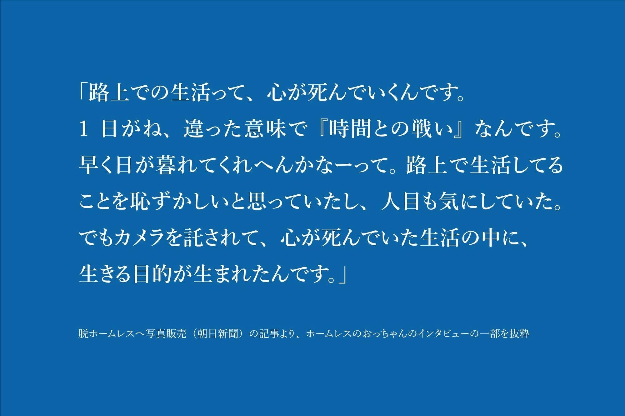 早く日が暮れてくれへんかなーって。 路上で生活してることを恥ずかしいと思っていたし、人目も気にしていた。でもカメラを託されて、心が死んでいた生活の中に、生きる目的が生まれたんです。」