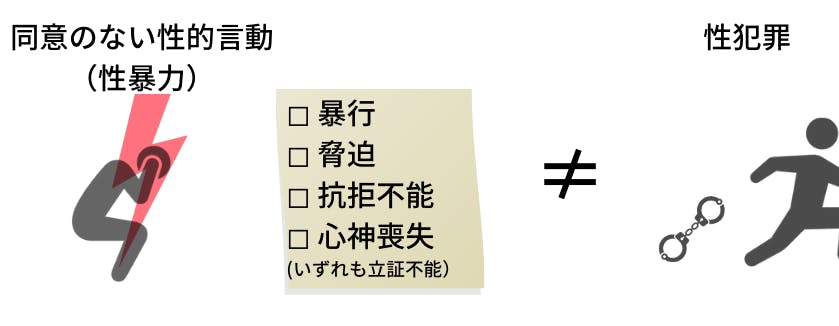 現在の法律では、同意のない性行為をされたことが明らかでも、「暴行」「脅迫」「抗拒不能」「心神喪失」などの要件を証明しない限り、加害者は罪に問われません。