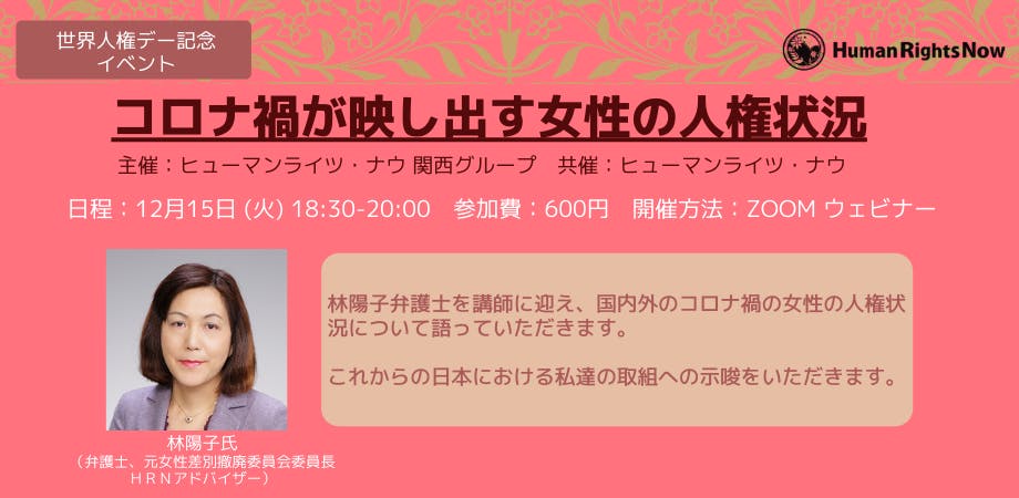 2020/11/27 17:00世界中が新型コロナウィルスと闘っており、人々の暮らしや人権に様々な制約が課せられるなどし、医療や福祉・経済活動はもとより、世界的にDVなどの女性に対する暴力の増加が指摘されるなど、その影響は生活全般に及んでおり、国連も懸念を示しています。今年の世界人権デーでは、2015年から2年間、国連の女性差別撤廃委員会委員長を務められた林陽子弁護士を講師に迎え、コロナ禍での女性の人権状況について考えます。ご自身がメンバーである「2018・2019G7ジェンダー平等評議会」が発した「コロナ危機におけるジェンダー平等と女性の権利に関する声明」のことや、ジェンダーギャップ指数が世界153か国中121位という世界的にも低位にある日本の女性の人権状況など、第一線で国際的な人権活動を続けてこられている経験を踏まえて、国内外のコロナ禍の女性の人権状況について語っていただき、これからの日本における私達の取組への示唆をいただきたいと考えています。オンラインという形式で行うため、双方向での交流には制約がありますが、全国各地の多数の皆様にご参加いただき、確かな意義のある人権デーにしたいと考えています。皆様のご参加をお待ちしています。主催:ヒューマンライツ・ナウ 関西グループ共催:ヒューマンライツ・ナウ * * * * *「コロナ禍が映し出す女性の人権状況」日時:2020年12月15日(火)18:30~20:00 講師:林陽子氏 (弁護士、元女性差別撤廃委員会委員長、HRNアドバイザー)開催方法:zoomウェビナー (peatixでご登録いただいたメールアドレスに、参加URLをお送りします。「視聴ページ」のリンクからも参加できます。)参加費:600円お申し込み&詳細:https://wrevent202015.peatix.com出演:林陽子氏1980年代から性暴力被害者のためのホットライン、外国人女性のためのシェルターなどで当事者の法的支援を行う。1998年-2000年自由人権協会事務局長。2004年―2006年国連「人権の促進と保護に関する小委員会」代理委員。2008年―2018年国連女性差別撤廃委員会委員(うち2015-2017年は委員長をつとめる)。2018-2019年G7議長国(カナダおよびフランス)により組織されたジェンダー平等諮問委員会委員。2018年津田梅子賞受賞。主な編著書「女性差別撤廃条約と私たち」(信山社、2011年)【問い合わせ先】認定NPO法人 ヒューマンライツ・ナウ 事務局(担当:中村)電話:03-6228-1528 Mail: akane.nakamura@hrn.or.jp もっと見る
