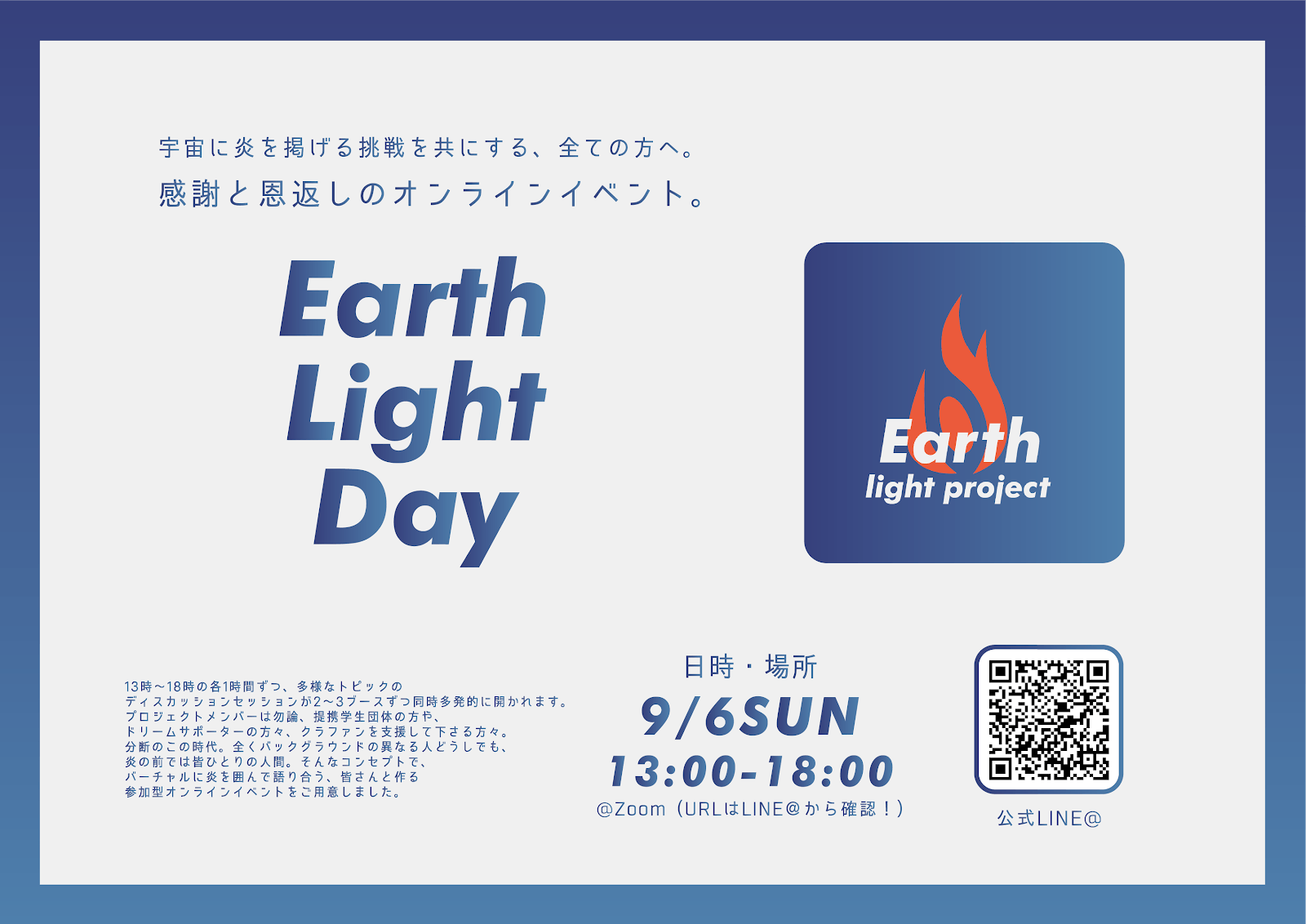 溢れんばかりの感謝の気持ちをこめて、ELP初となる皆様と対談できるオンラインイベント「Earth LIght Day」を開催いたします。ぜひご友人や、ご家族をお誘いの上奮ってご参加ください。