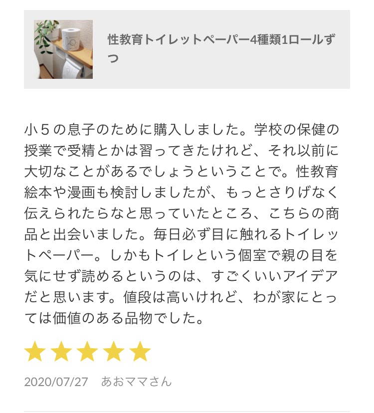 去年行った性教育トイレットペーパーの最初のクラウドファンディングでもたくさんの応援の声をいただきました。詳細はこちらから(現在は、定期購読や年齢にあわせた販売はおこなっておりませんが、活動内容の目的や概要は変わっていません。)