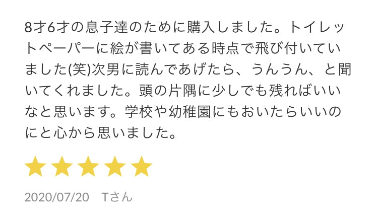 販売してみると、「高いけれど 価値ある商品。もっとたくさんの場所で設置してほしい。」などの声をたくさんいただきました。また、未就学児や小学生くらいのこどもをもつ保護者ほど、設置後に「お股触るのは他の人がいるところでしたらダメだよ」「赤ちゃんはこうやってできるんだよ」などの話をしやすくなったそうです。逆に中〜高校生くらいの子どもを持つ方からは「こどもが恥ずかしがる」という声がありました。(恥ずかしい一方、興味はあるので トイレの中で読んでいるみたいです)