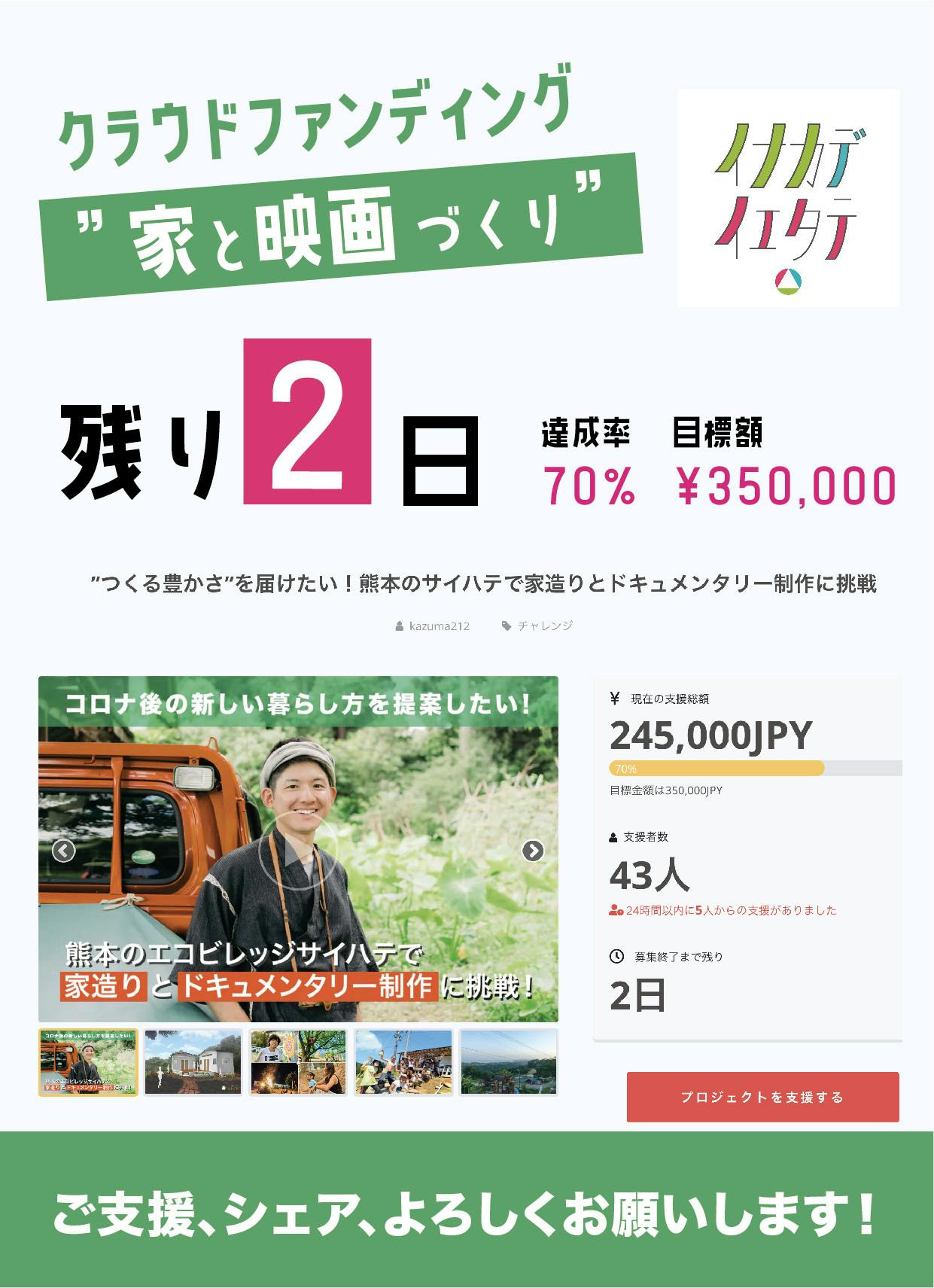 2020/09/17 06:55クラウドファンディング終了まであと3日。と同時に家づくりもどんどん進んでいました。そしてドキュメンタリー制作をするならば、と動画素材を有効活用してYouTube「イナカデイエタテ」も着々と更新しております。毎日どんどん育っていってる感覚です。《イナカデイエタテ》https://www.youtube.com/channel/UC0Bbt9Ras4t4BxNRwY61kow/ このサムネイルの作成は 五十川 都志子 におまかせしております。ロゴも彼女の発案で、アーティステックなセンスを持ってて素敵。SNSの運用はメンバーの 影澤亮佑 髙橋 政臣に担当してもらってます物事をチームでやるってホント良いなとしみじみ感じてます。そんなわけでクラウドファンディング「”つくる豊かさ”を届けたい!熊本のサイハテで家造りとドキュメンタリー制作に挑戦」がもうすぐラストスパートです。https://camp-fire.jp/projects/view/320939 もっと見る