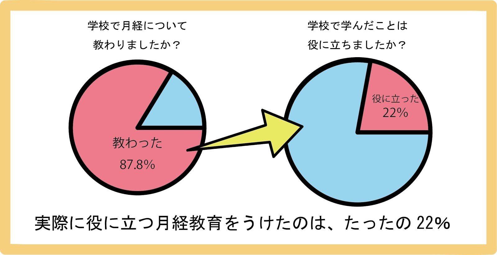 すでに初経を迎えている198人にアンケートをした結果、「学校で月経教育を受けたことがある人」は87.8%と多いにもかかわらず、その知識が初経が来たとき「役に立った」と答えたのは22%と少数でした。