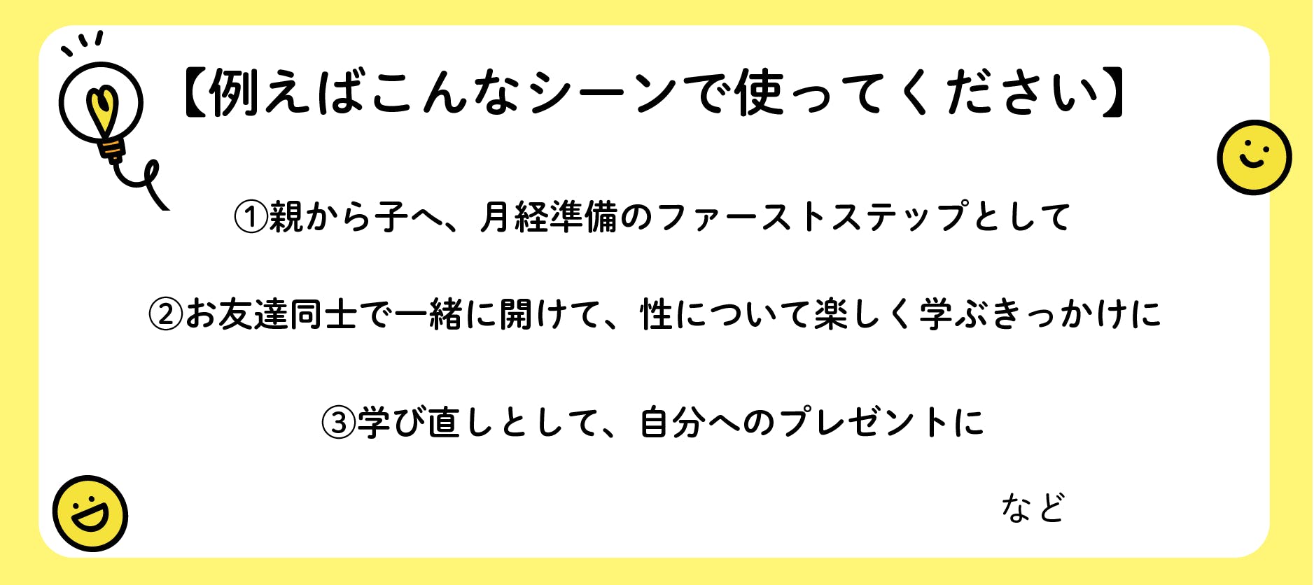 性について学ぶことはとても大切なこと。しかし特に親子間などでは、性をテーマに話すことに恥ずかしさや戸惑いがあるかもしれません。そんな時にこのBOXを子ども達に贈っていただくことで、コミュニケーションのきっかけを作ることができます。