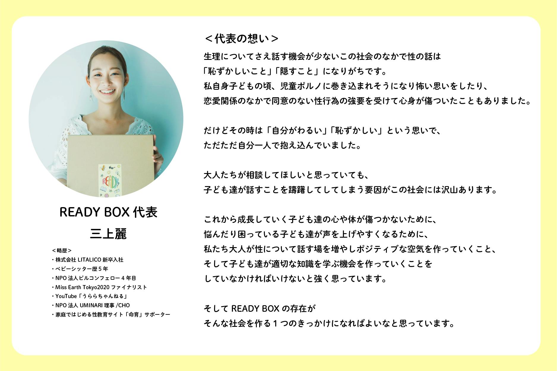 初めまして!READY BOXプロジェクト代表の三上麗(みかみうらら)です。現在、正しい性知識が楽しく学べる機会を多くの方へ届けるため、はじめての生理準備BOX「READY BOX(レディーボックス)」を開発しています。