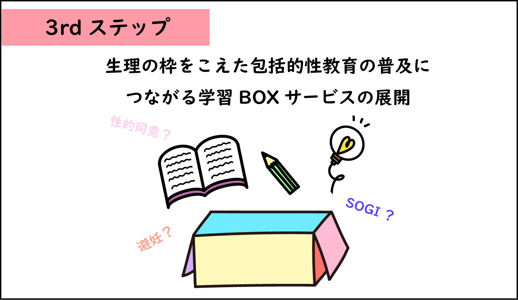 将来的には生理の枠をこえ、包括的性教育の普及につながる学習BOXや教材サービスの展開をしていきたいと考えています。例)性的同意、避妊、SOGI、プライベートゾーンなど