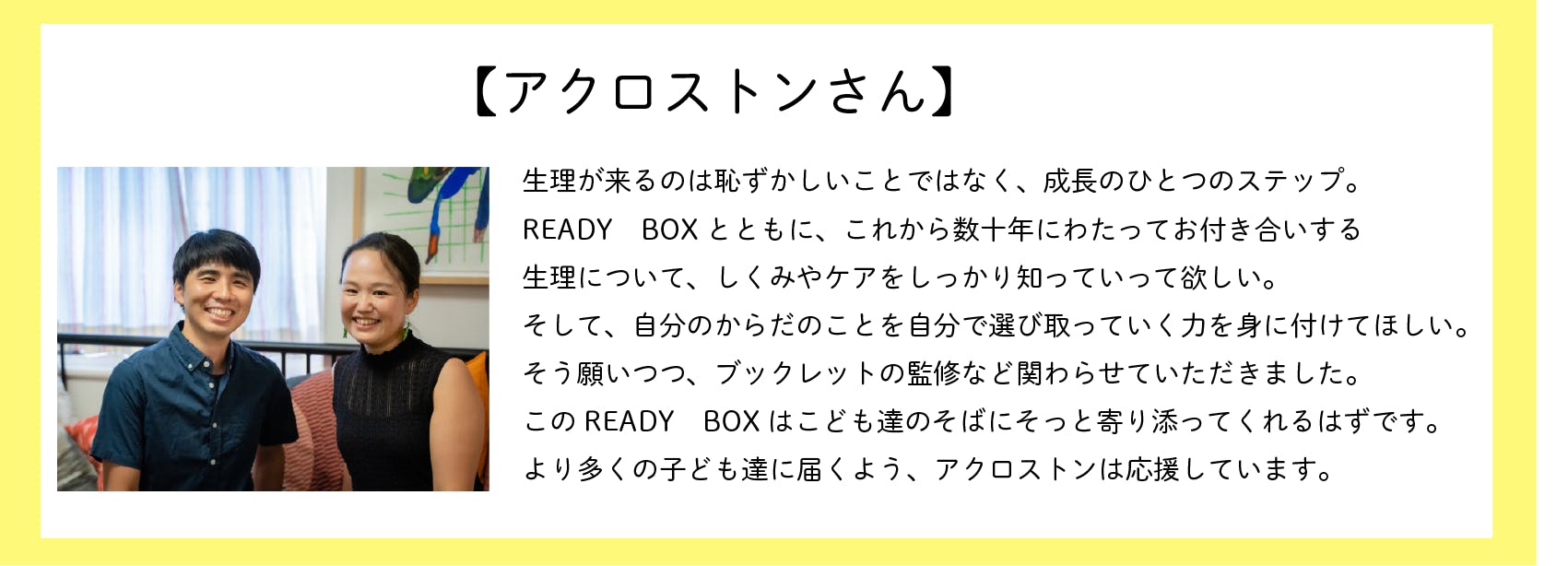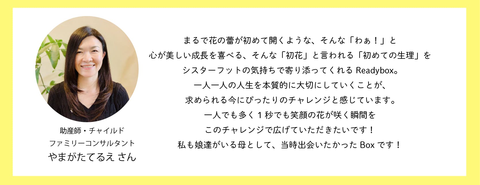 このように自分の経験を振り返ってみても、初経がくる時期にしっかりと性に対して向き合う環境や機会があったら良かったと今でも思っています。初経を迎える子ども達に「性について学んだり話すことはタブーではない」ということ、そして「不安や困りごとがあれば相談してもよい」という安心感を伝えたいと考え、「READY BOX」を開発することに決めました。