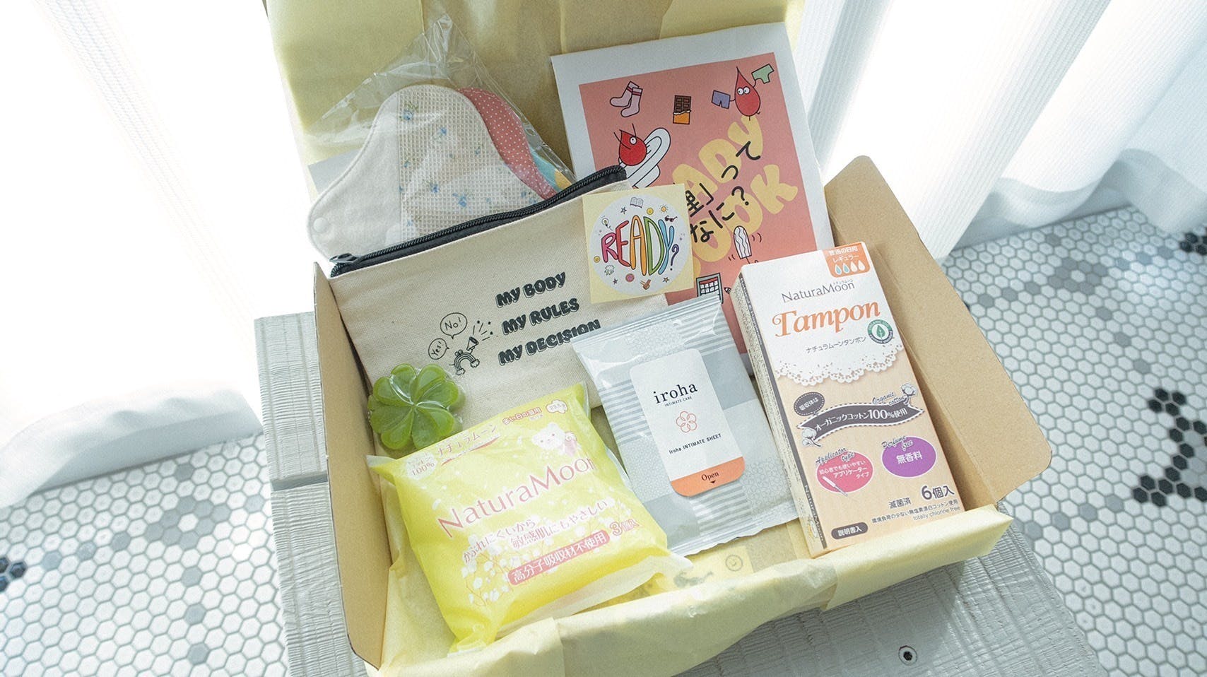 READY BOXとは、ナプキンやタンポン、布ライナーなどの生理用品やポーチ、生理について学べるブックレットなどが入っているはじめての生理準備BOXです。子どもたちがBOXを開けてワクワクできるだけでなく、必要な性の知識を学べて、新しい選択肢を得ることができる「準備キット」のようなものです。