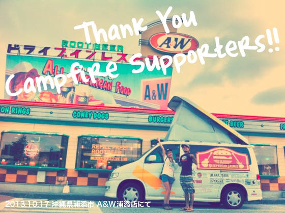 2013/10/31 00:42ご報告が遅くなりましたが、10/13をもちまして僕たちの「ハンバーガー食べ歩き47都道府県 無期限ライブツアー」、380日かけて47都道府県目の沖縄にて152店鋪目の名護市 Captain Kangaroo でツアーファイナルを迎え、無事ツアー完走しました! どんな旅だったかは、こちらのショートドキュメンタリーにまとめましたのでぜひご覧いただければと思います。 本日2013/10/30、全てのお約束したリターンも遂行完了しました。 (希望の無かったパトロンさん分除く) 更には2013/2/13に中間報告しました残金も、 ・メンテナンス ・車内利用用品 ・フェリー車載費 など宣言通り車に携る経費として、余剰金を以下の通り使わせていただきました。 これをもちまして、僕たちが開催しましたCampfireプロジェクト「自宅を引き払い、無期限の47都道府県ライブツアーの為にキャンピングカーが必要です」全ての行程を完了し、プロジェクト終了をここに宣言させていただきます。 言うまでもありませんが、このツアーは皆様にご支援いただいて購入しそして作り上げた「ケチャマス号」無しでは、絶対にできない旅でした。そして1年に渡って2人っきりで歩んでき長い道のりも、その間ずっと3人目のメンバーである「ケチャマス号」=Campfireサポーターの皆様の存在を追い風に感じながらの道のりで本当に頼もしかったです。 おかげさまで「ツアーを通して叶えたい願い」として当初掲げた4つの目標 「ハンバーガーカルチャーを盛り上げたい」「ライブミュージックをもっと身近にしたい」日々のハンバーガー店でのライブを通して、間違い無くできたと思います! 「ミュージシャンの活動の場所を増やしたい」実際に僕たちのライブをきっかけに定期的にライブイベントを始めたお店さん、更にはなんとステージを作ったお店さんもありました! 「ミュージシャンとして生きる、1つの新しい形を提案したい」380日そして今もなお、音楽で生計を立てる事に成功して、名実共に1つの新しい形を体現できたと思っています! と、全て願いを叶える事ができました。 しかし喜びに浮かれる暇もなく、僕たちには「日常をミュージシャンとして生き抜く」という大きな大きな難題を絶え間なく抱える事になりました。そして永遠に続く日常を生き抜く事は、1つのツアーを成功させる事よりもずっとずっと難しい事だとひしひしと実感しています。 「ここからがスタート」ありふれた言葉ですが、本当にその通りなので、波のように押し寄せる日常に臆する事なく、一生懸命1日1日を生き抜いていこうと思います。 またお力をお借りしなければならない事があるかもしれません。その際はどうぞよろしくお願いします。 もちろん、これからも「ケチャマス号」は皆様のお名前を載せたまま大事に使わせていただきます。 また日本のどこかでこの車に乗った僕たちを見かけたら、ぜひ声をかけてくださいね。 一緒にハンバーガーパーティーしましょう! ありがとうございました。 そしてこれからも、よろしくお願いします! Sleepyhead Jaimie すわだいすけ 伊澤ゆく もっと見る