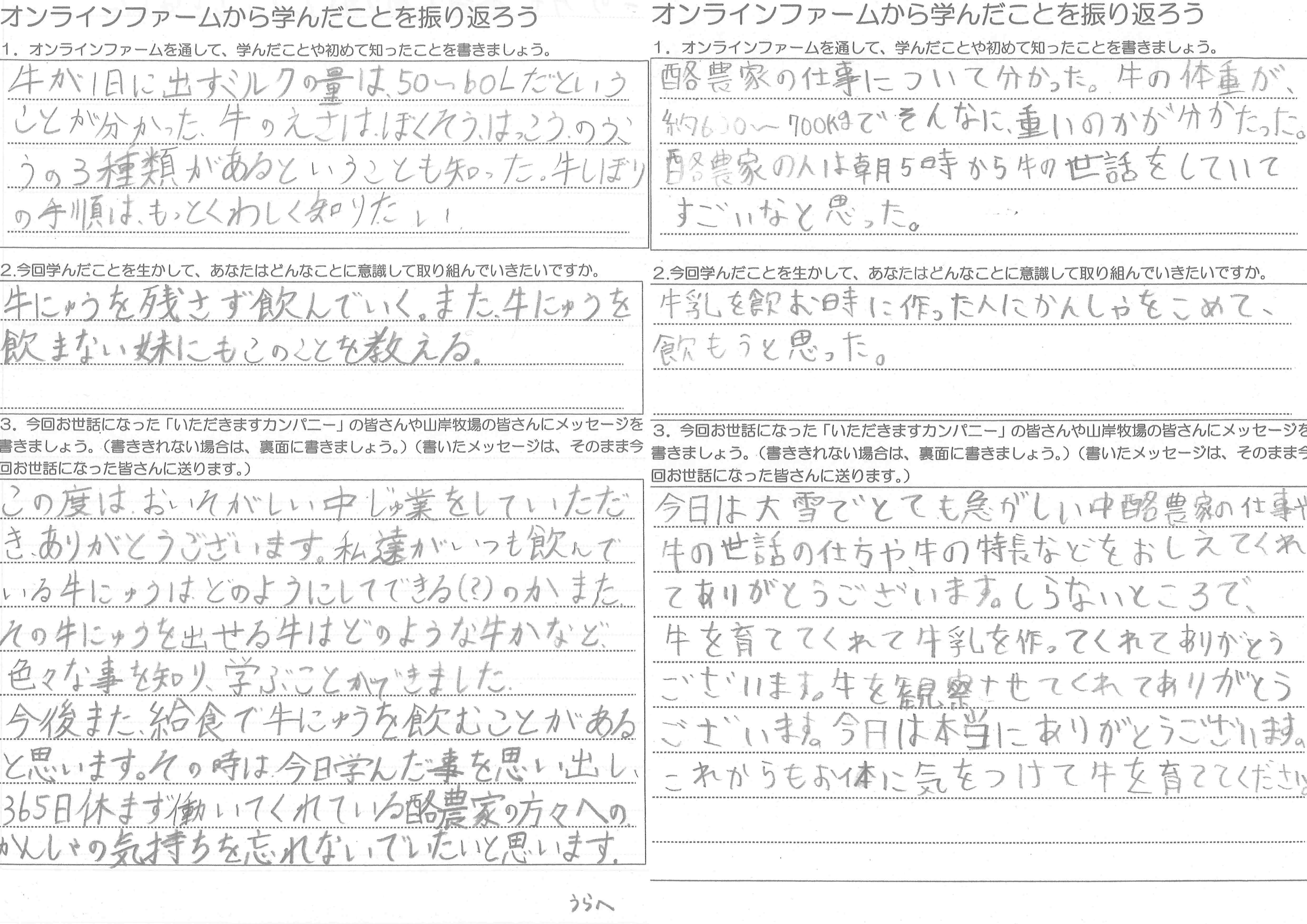 子どもたちは、「なめられてる!」「牛がおしっこした!」と大興奮。まるで現地を訪問したかのような感想をくれました。期待しつつも疑心暗鬼だった先生方も、子どもたちの様子にオンラインの可能性を感じて下さいました。