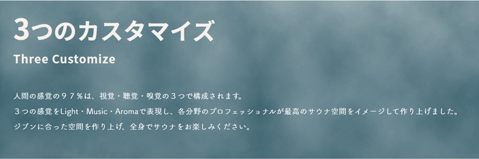 サウナでは感覚が敏感になり、周りの環境が気になってしまうことが多いように感じます。ジブンに合わせた環境で存分に楽しんでいただけるように、カスタマイズできるようにいたしました。”ととのうため”に設計されたLight・Music・Aromaを各3つのパターン中からお選びいただき、お楽しみいただけます。