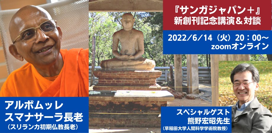 2022年6月14日(火)に、アルボムッレ・スマナサーラ長老による『サンガジャパン+』新創刊記念オンラインセミナーを実施します。当日はスペシャルゲストとして早稲田大学人間科学学術院教授の熊野宏昭先生にご参加いただくことが決定しました。