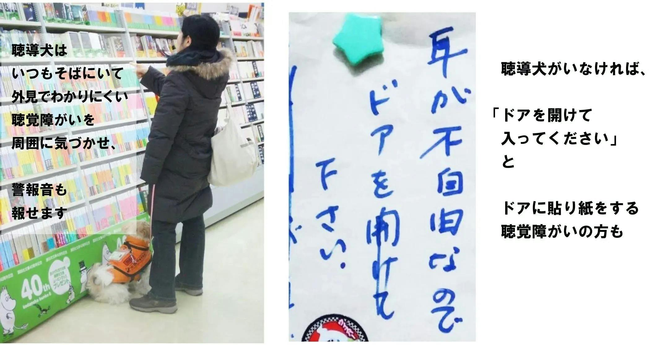 例えば、「聴導犬」ユーザーである聴覚障がいのある方は、宅配の方がドアベルを押しても、そのドアベルの音が聞こえません。不在通知が投函され、宅急便は受け取れません。
