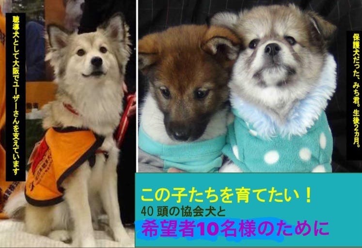 聴導犬と介助犬訓練および、ユーザー18名様のアフターケア、希望者10名様への面接、家庭訪問や体験。そして、協会犬40頭の食費、医療費などの年間必要経費1200万円のために、ネクストゴール:目標額1000万円に