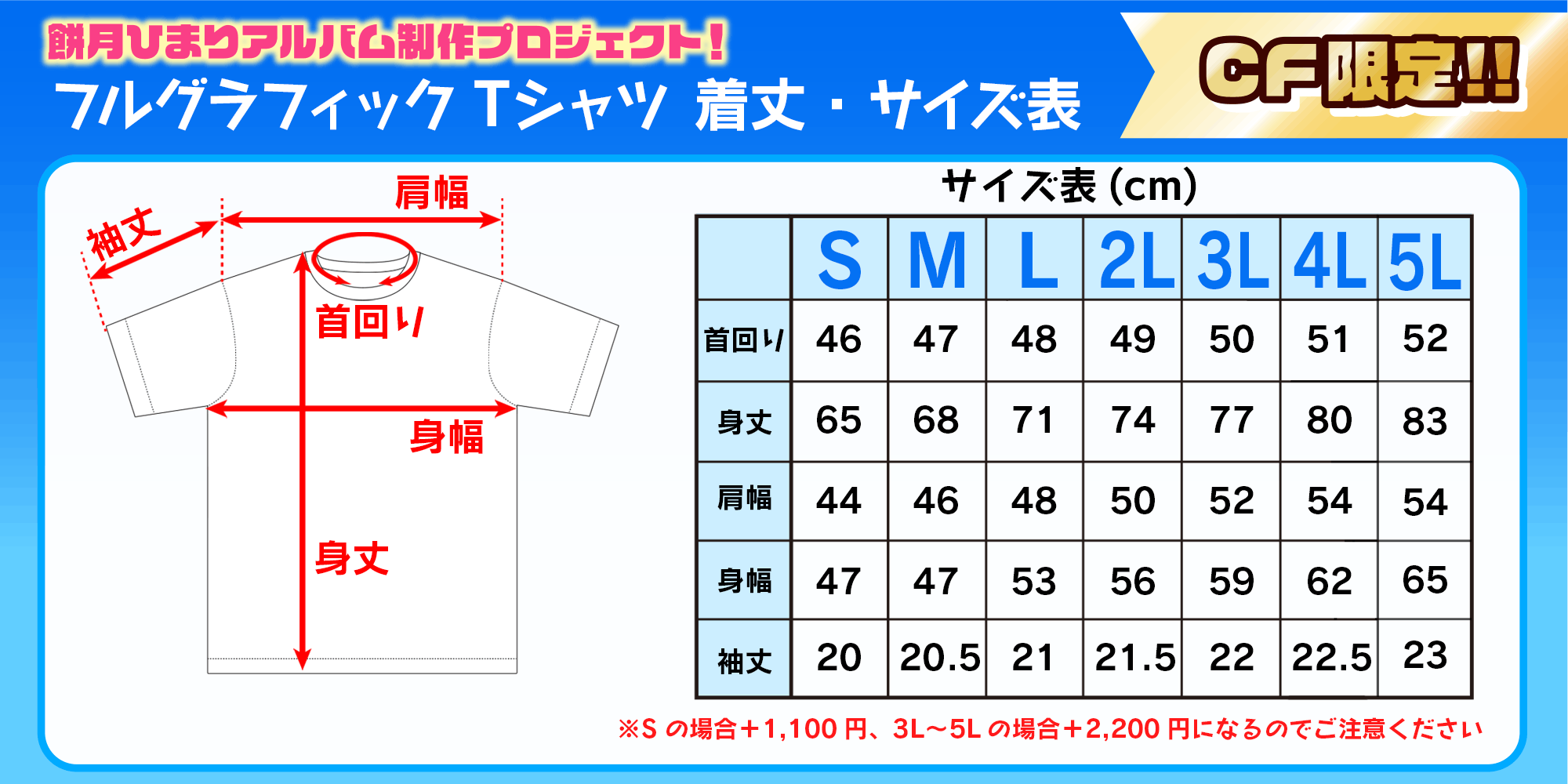 A:支援時に上記の上乗せ金額を忘れてしまった方は、餅月ひまり応援コースに追加してお支払いをお願いいたします。ひま倫TシャツのXS(元の上乗せ支援額1,100円)をご希望の方は1,100円の餅月ひまり応援コースに上乗せ無しでのご支援を、フルグラフィックTシャツの3XL(元の上乗せ支援額2,200円)をご希望の方は1,100円の餅月ひまり応援コースに+1,100円を上乗せしてリターン合計金額が2,200円になるようにお支払いください。また餅月ひまり応援コースの支援時に備考欄に必ず「(例)ひま倫Tシャツ or フルグラフィックTシャツの●サイズの上乗せ不足支援です」という言葉を添えてください。