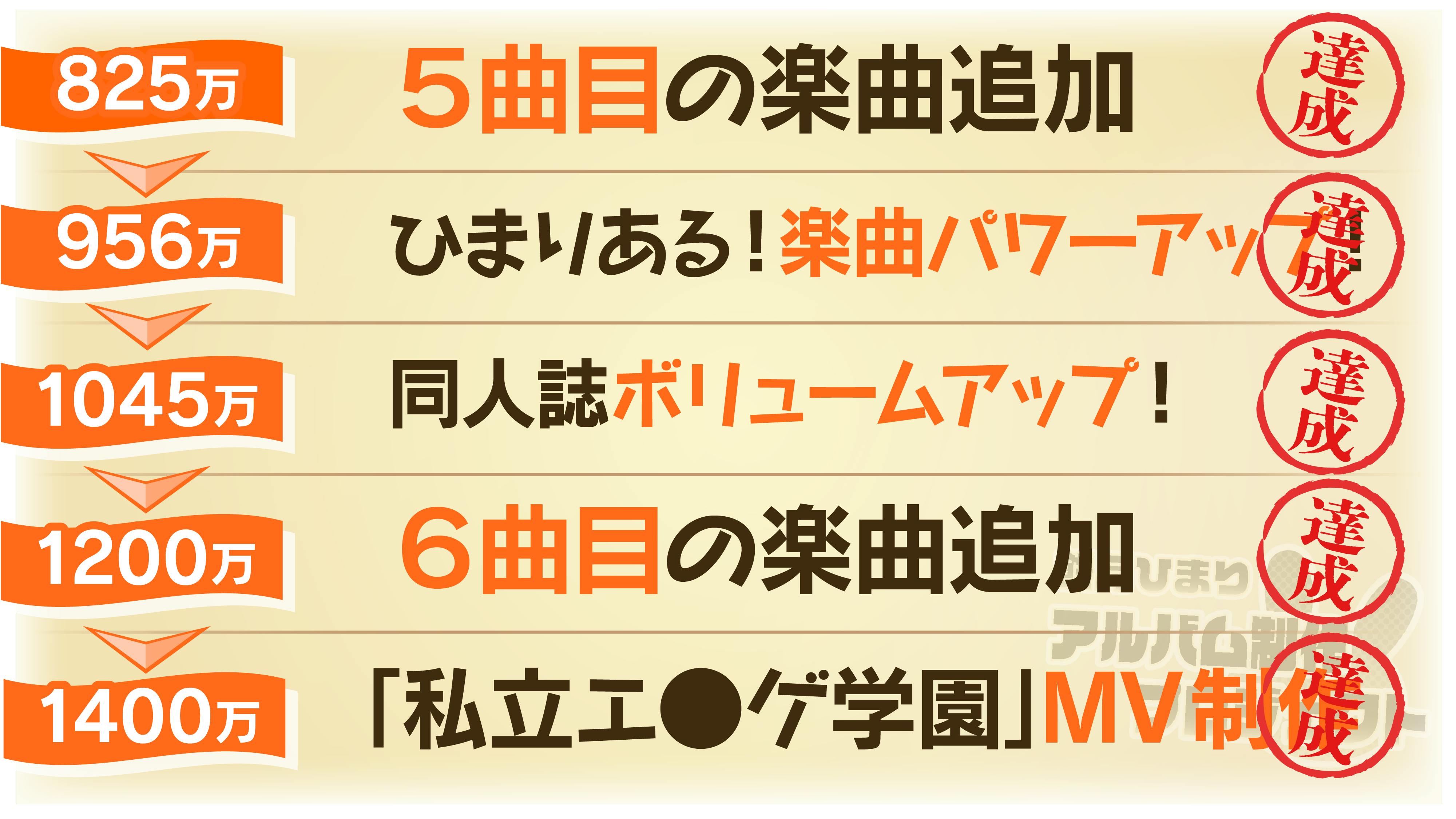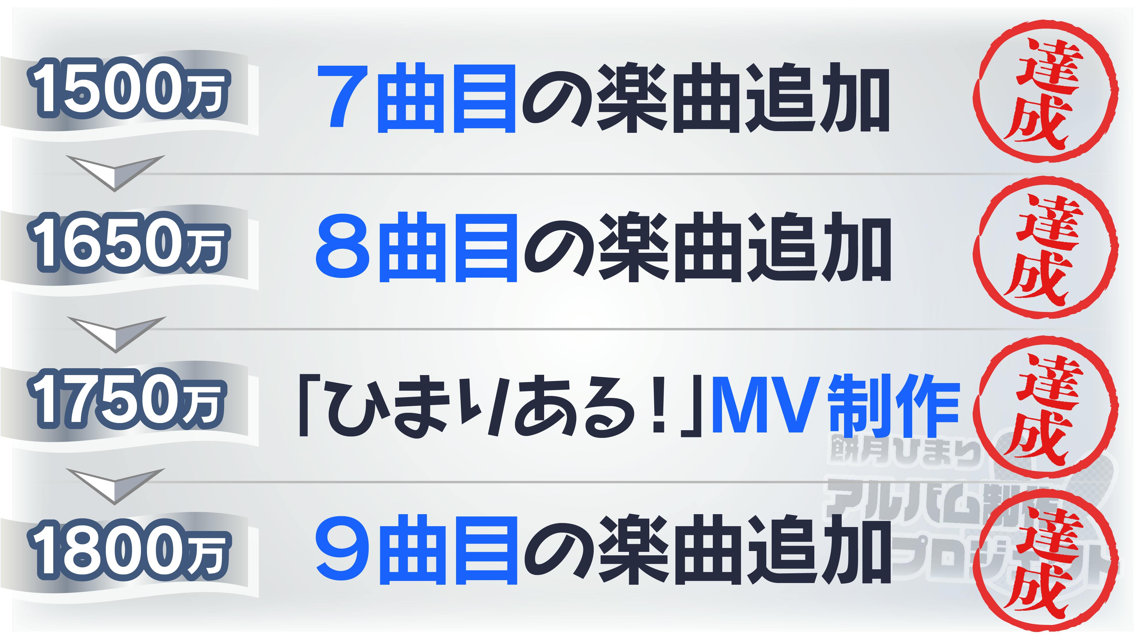 目標全達成おめでとう! これからが大変だけど、準備は整ったね。 最高のアルバムを作って可愛い衣装を着て派手に歌ってくれよ!