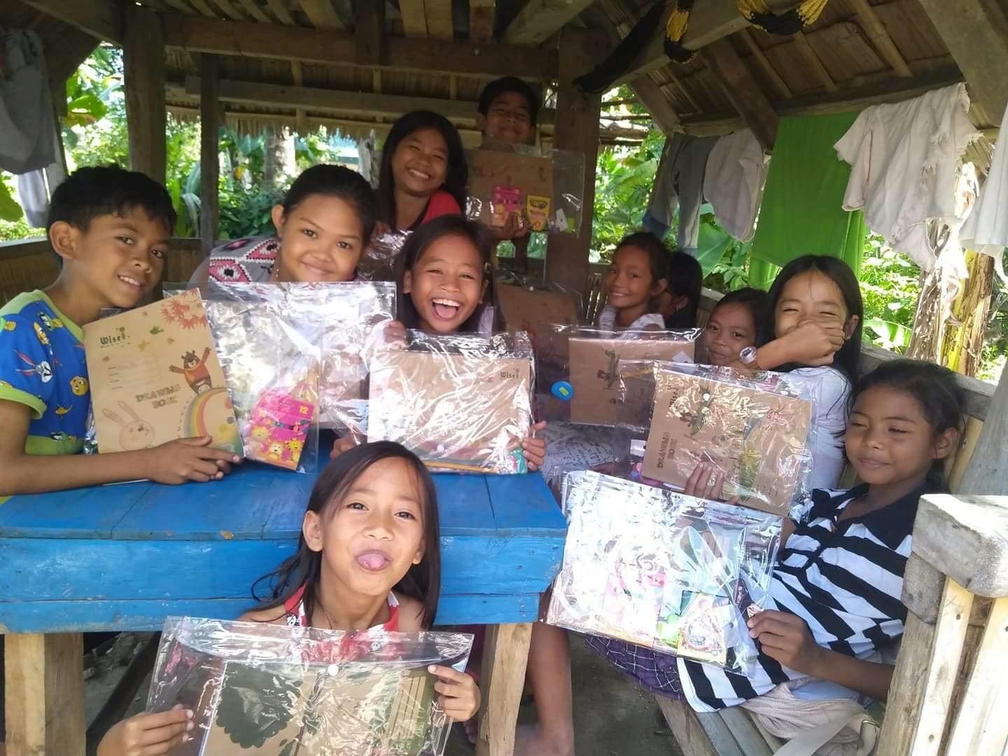 ↑新品の文房具セットを受け取って大喜びの子どもたち(コロナ前に撮影)