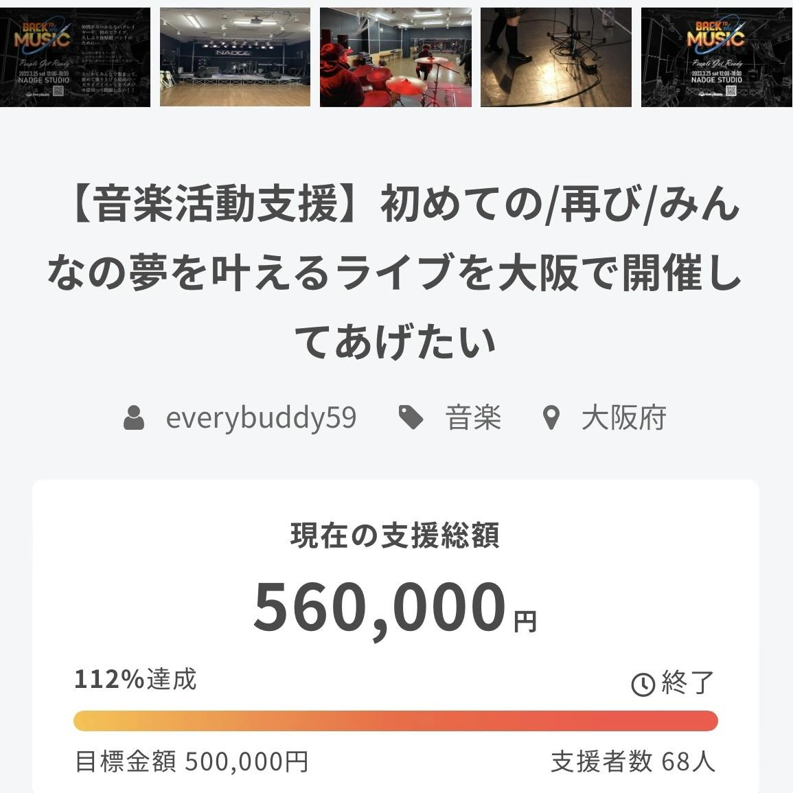 2023/03/25 04:17【ありがとうございました】目標金額:500,000円支援総額:560,000円支援者数:68人目標達成率:112%まず、ご支援いただいた方々には心から御礼を申し上げます。初めてのクラファンはなかなか上手くいかないときいていたのですが、皆さんの暖かいお気持ちのおかげで目標を大きく上回る結果となり、もう何と御礼を言えばいいのか!できることなら一人一人訪ねて行ってハグでもしたいくらいです。本当にありがとうございました!【3/25 Back to the Music】いよいよ本日となりました。*もし、急遽会場入場希望の方は直接2F受付にいらしていただければ対応いたします(入場料2,000円)2021年6月のコロナ延期の後、11月にスタートし、ほぼ毎月開催してきました出演者公募型ライブイベント『Back to the Music』(以下BTTM)発表の場が減っている音楽活動を趣味としている方々のために、少しでも活躍の場を!そしてみんながそれぞれの大切で特別な音楽に戻ろう!というコンセプトで開催してきました。Back to the Music とはご存じかと思いますが、最近はようやく街で開催されるイベントも増えてきて音楽活動される方々の勢力的なライブ姿もよく見られるように感じています。そんな中当初のBTTMの目的は、一旦ここで終了でいいのかなと思いまして。今回は集大成の意味を込めて「初めて・再開・マッチング」に限定した出演者の募集としました。勇気を持って初めてのライブに挑戦された方。何十年ぶりという久しぶりのライブに昔の仲間と挑戦される人生の大先輩の方。バンドでやってみたい夢を叶えようと応募してくれた方。そしてそういう方々を助けてあげようと立ち上がってくれた現役のサポート陣の方々。またこのコンセプトに共感いただきクラファンで多大な支援をくださったみなさん。今までのBTTMがそうであったように、今回も私たちだけでは決して成し遂げることができないこと。みなさんに支えられているからこそのことだと、改めて実感しています。朝早いのにこんな時間まで綴っているのが感動の証拠と思ってください(現在午前4時。笑)本当に、みなさんには感謝しかございません。以下、支援くださった一部(リターンにお名前掲載含む)の方々を紹介させてください。【ご支援者さま(敬称略)】イーストブック/koji0731t/なかやま たかし/仮フラワー/ながやん/佐藤 貴俊/伊東 真理/佐藤 晃一/玉川 千陽/三品 正洋/伊藤 健/岡田 和也/志岐 遼介/松本 直人/めだか家・和(和み)/すぎほちはや/M6/たかいえ!/mie-mie/ぼりびぃ/マキシマス/フォト検2級君/柿平 順子/平 健介/福原 栄二/奥村 雅一/冨重 真帆/大井 雅也/有田 須美江/石塚 大二郎/西嶋 雅己/吉本 純一/弥園 秀和/野村 美雪/岡崎 ゆい/松田 光司/大橋 千賀子/越智 勝寛/Pocketny Gladiolus/西川 孝彦/髙野 敏彦/田中 稔久/KENZO/m.minami/東尾 佳昭【協賛ご支援】◆タビオ株式会社 https://tabio.com/jp/corporate/◆株式会社Kips http://www.independents.jp/ https://mercymercy-music.com/◆THE GORO BAND https://www.facebook.com/goroband.gmwその他、生配信チケットご購入の方はもちろん、ご支援いただいた方全てに当日の生配信限定URLをクラファンご登録のアドレスにメールにてお送りしていますので、どうぞご確認ください。念のため、後ほど再度お送りいたします。後日アーカイブでもご覧いただけるようにいたしますが、出演者のみんなを応援するお気持ちで、ぜひリアルタイムで観覧いただけると幸いです。本日はみなさんにお目にかかることができるのを楽しみにしています。改めまして、ありがとうございました。株式会社Every Buddy代表 松本 恵 もっと見る