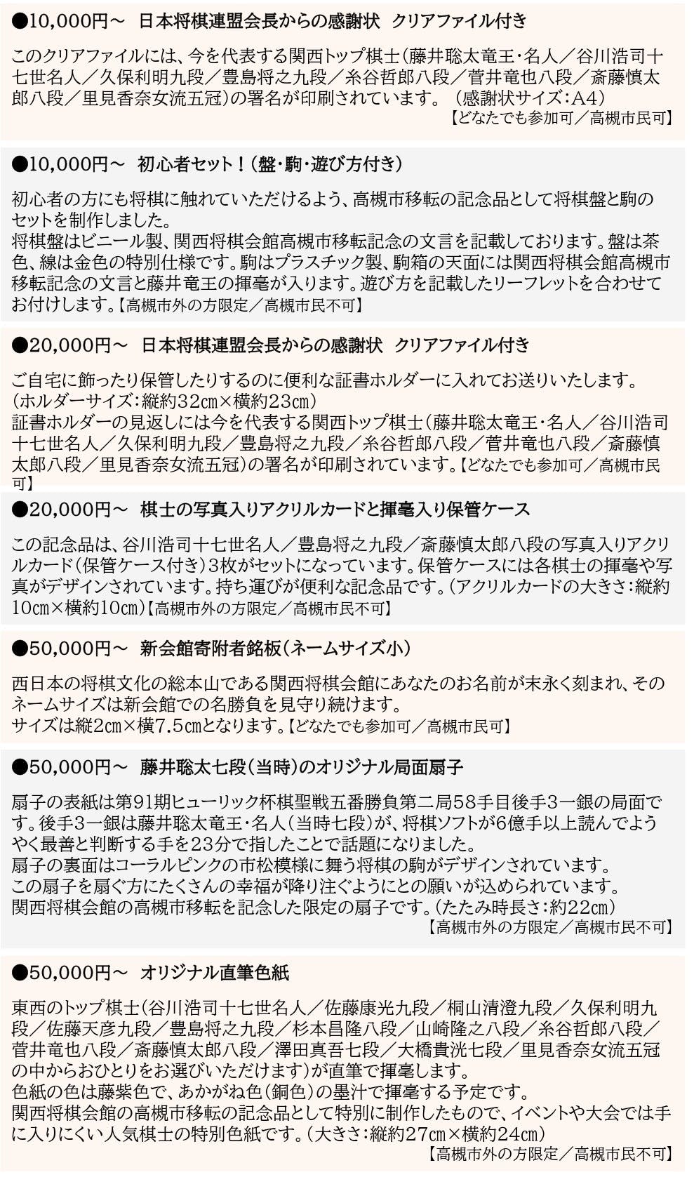 2024/12/10 14:00平素より「関西将棋会館建設プロジェクト」にご支援とご協力を賜り、厚く御礼申し上げます。現在挑戦中の「第5期関西将棋会館建設プロジェクトFINAL」における記念品について、情報更新がありましたのでお知らせします。第5期関西将棋会館建設プロジェクトFINAL一門対抗団体戦の観戦イベントにつきまして、未定となっておりました1チームの参加棋士が次のとおり決定いたしました。・連合チーム(都成竜馬七段・大橋貴洸七段・西川和宏六段)本記念品は、限定50名様(先着)となっておりますので、ぜひお早めにお申込みください。【記念品詳細】一門対抗団体戦の観戦イベント(寄附額100,000円)新関西将棋会館で一門対抗団体戦の観戦などをお楽しみいただけます。●開催日時令和7年2月22日(土)10時30分~17時30分頃●出演棋士井上一門(船江恒平七段・出口若武六段・上野裕寿四段)、森一門(山崎隆之八段・糸谷哲郎八段・大石直嗣七段)、小林一門(池永天志六段・冨田誠也五段・井田明宏五段)、連合チーム(都成竜馬七段・大橋貴洸七段・西川和宏六段)の計4チーム総勢12名●イベント内容ぐるぐる将棋、お好きなチームとの記念撮影、1回戦一斉対局観戦、トークショー、決勝戦大盤解説など。※上記は予定のため変更になる場合があります。 もっと見る記念品追加のお知らせ