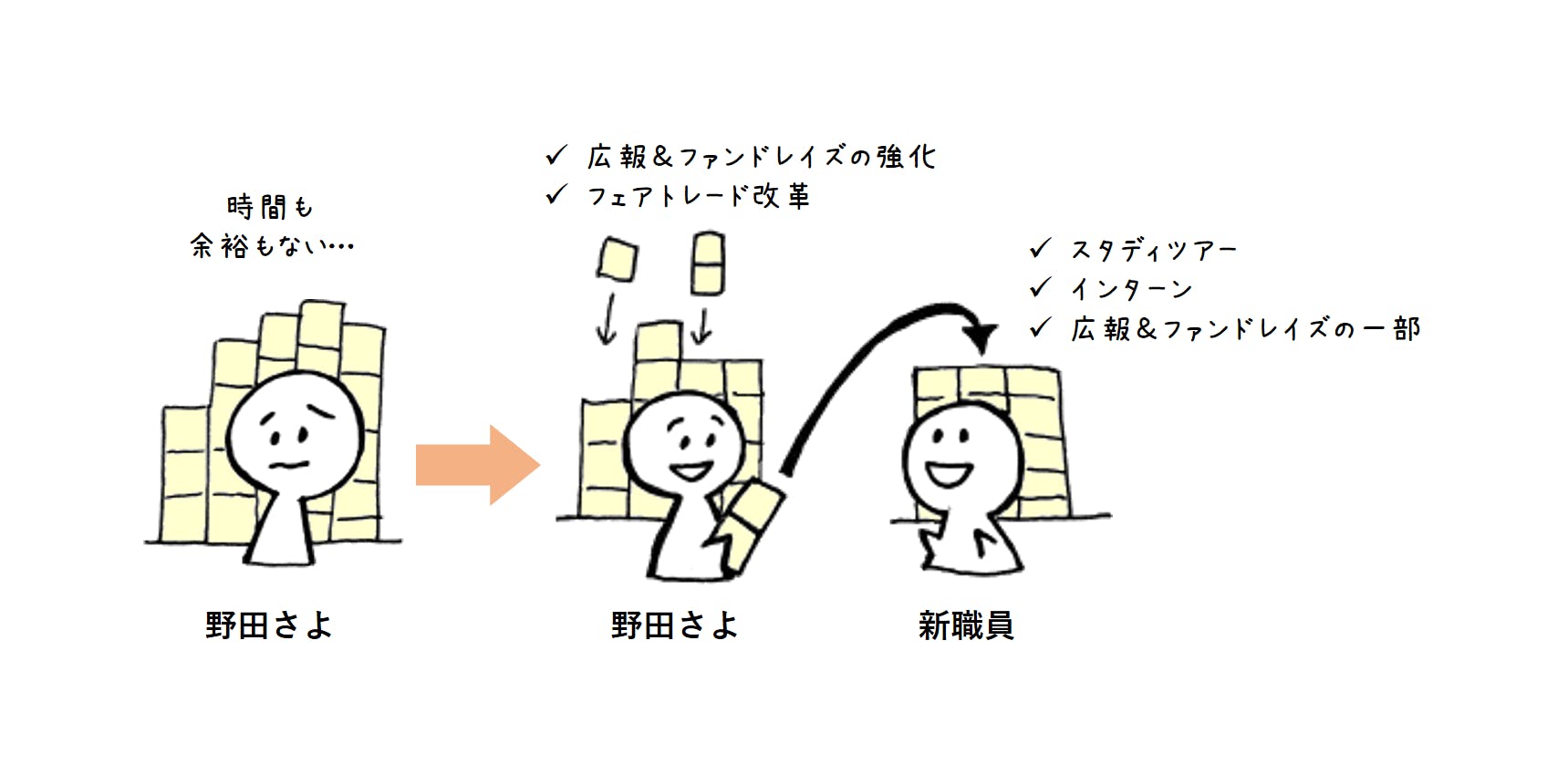 まず、これまで私が一手に担ってきた「日本の若者の生きる力を伸ばす活動」(スタディツアー、インターンシップ、ボランティアの受け入れ)などを新職員と分担します。そうして得た時間を活かし、私は講演やイベント登壇回数を増やして、協力者を増やします。並行して、課題山積のフェアトレード事業の改革にも取り組みます。