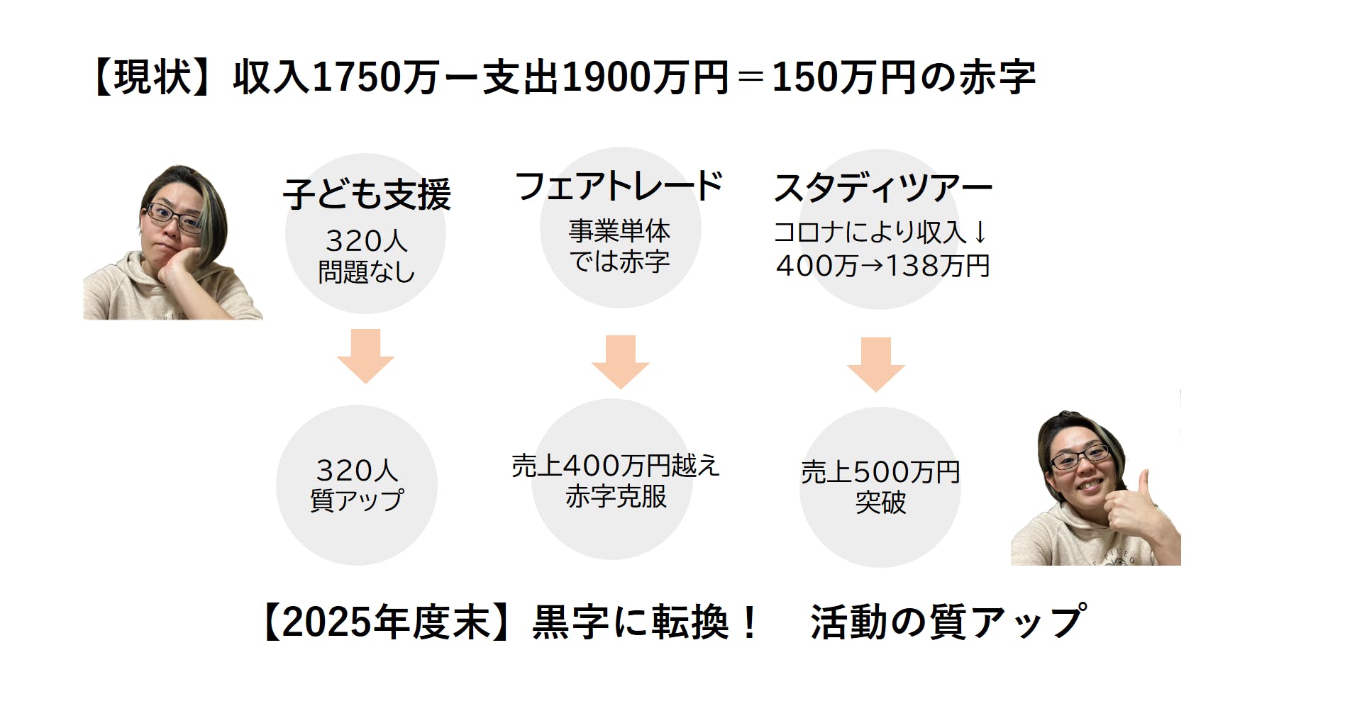 (経営改善の具体イメージ ①スタディツアー参加者増による収入アップ ②寄付者・サポーター数増加による収入アップ ③フェアトレード商品の売上アップ)