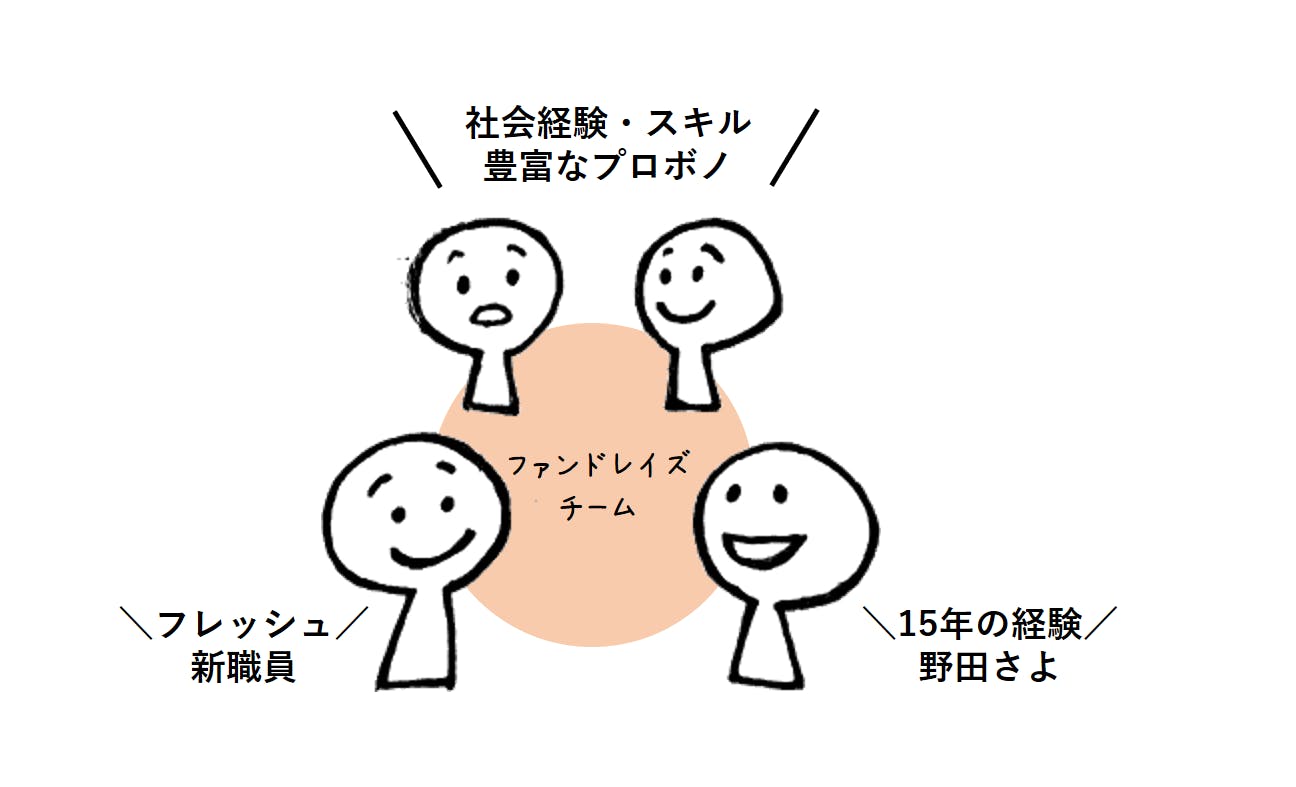 そこで、新職員の勤務開始と同時に、私・新職員・プロボノ(社会人ボランティア)数名で、ファンドレイズ・チームを立ち上げます。アクセスでのボランティアを経験したのち、仕事でマーケティングや企画を経験してきた方にプロボノとして関わってもらうことで、「即戦力×専門性×フィリピンへの想い」をエンジンにしたチームを作るのです。