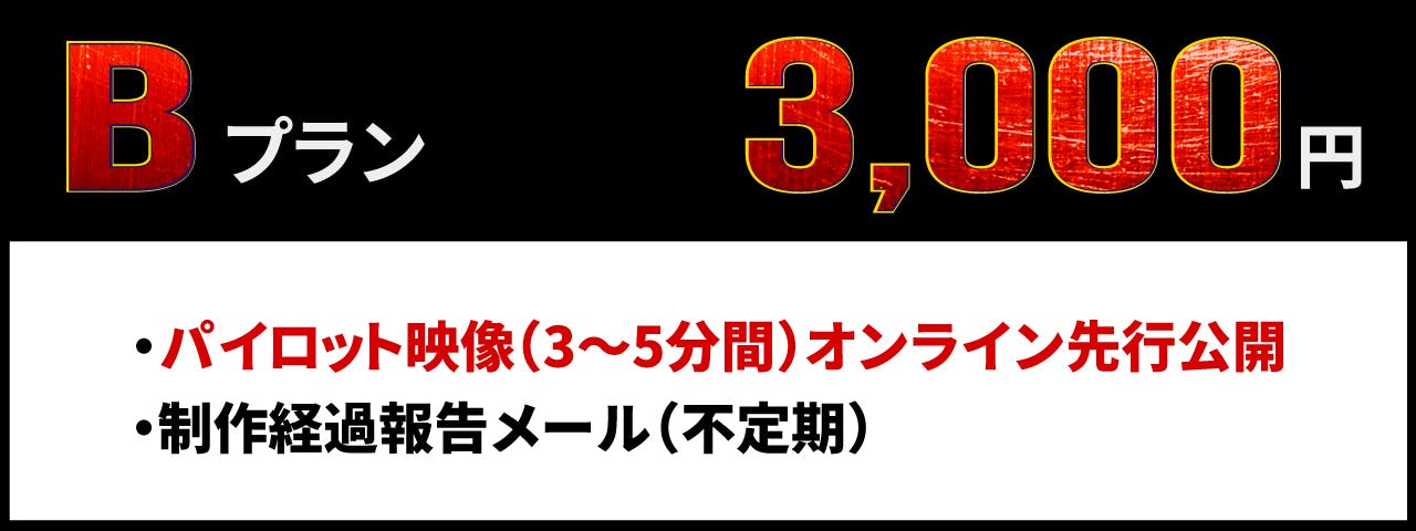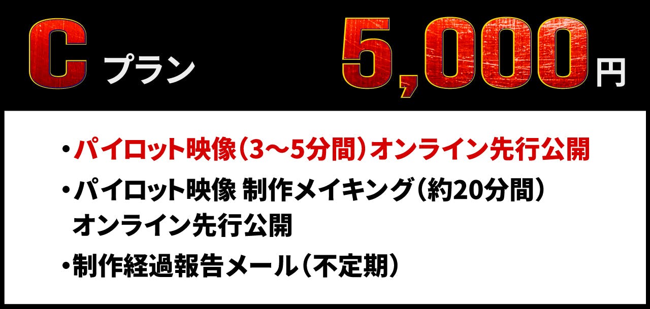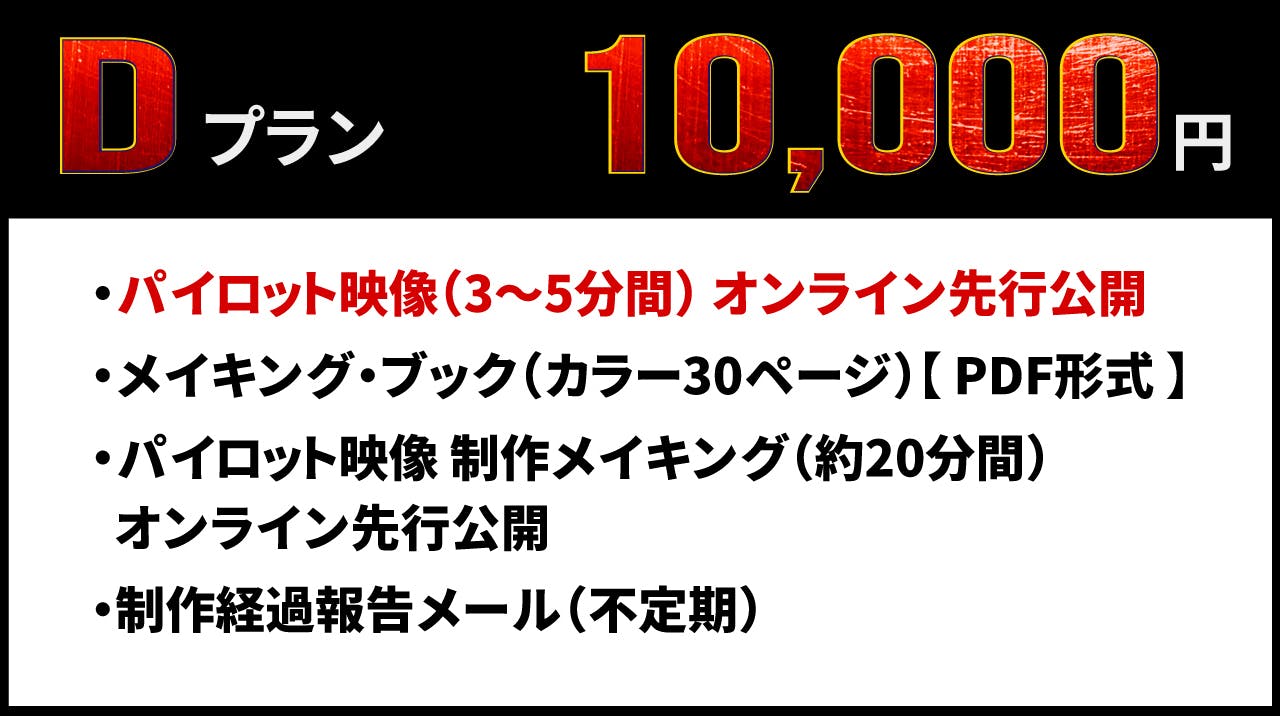 ※ 動画配信時期:「パイロット映像 オンライン先行公開」の時期よりずれる場合がございます。予定が変更される場合は、あらかじめCAMPFIRE内メッセージ、または活動報告にてご連絡致します。