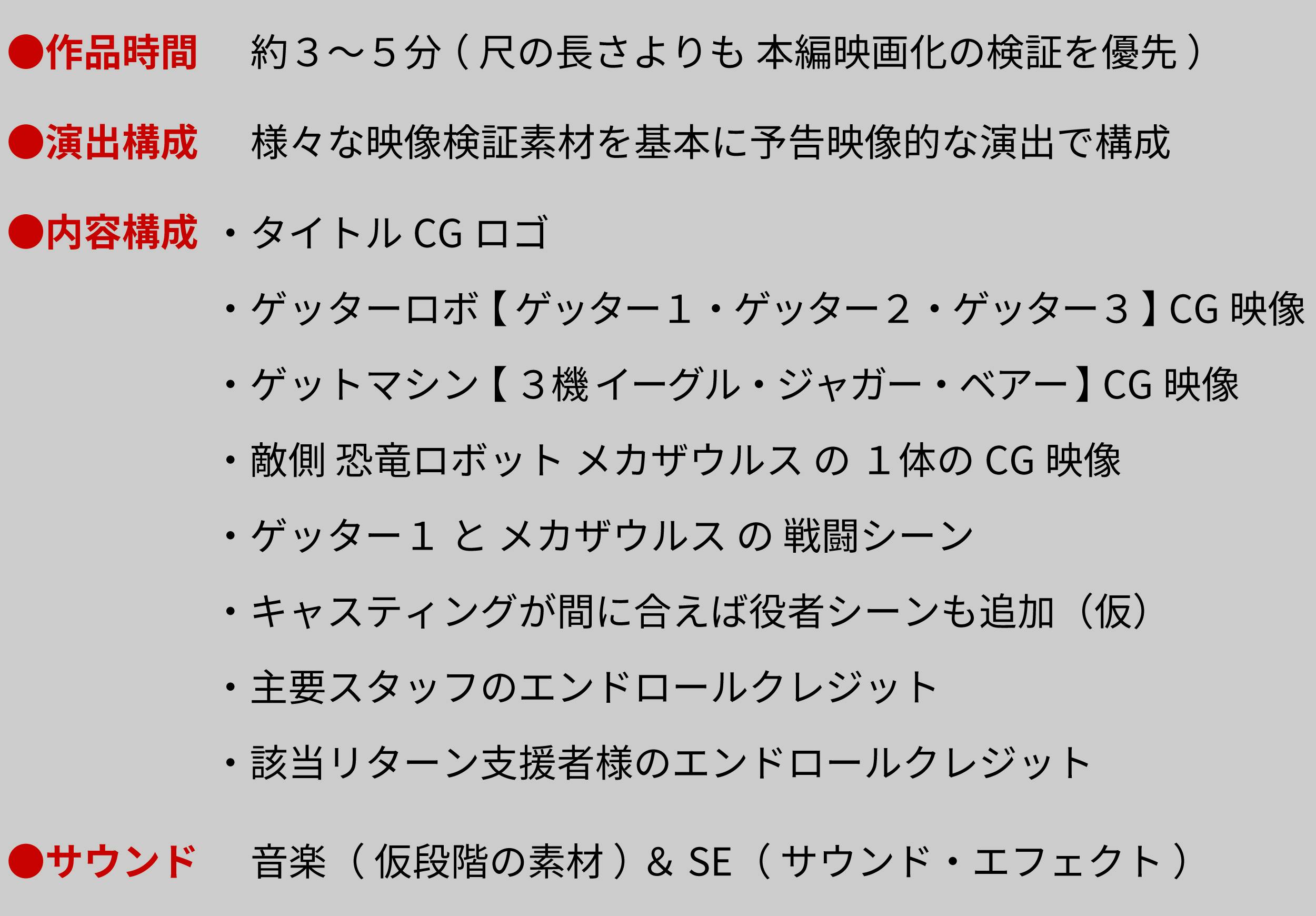 我々は議論を重ねた結果、実写版『 ゲッターロボ 』 プリプロダクション段階で、映画本編と別予算枠で 様々なビジュアル試作、3DCG、テスト映像を主とした 【 パイロット映像 (3〜5分間) 】の制作が最良の方策であるとの結論に至りました。