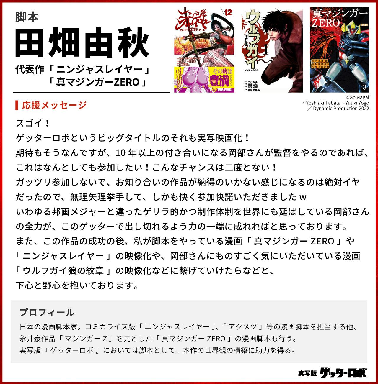 また、この作品の成功の後、私が脚本をやっている漫画「 真マジンガーZERO 」や「 ニンジャスレイヤー 」の映像化や、岡部さんにものすごく気にいただいている漫画「 ウルフガイ狼の紋章 」の映像化などに繋げていけたらなどと、下心と野心を抱いております。