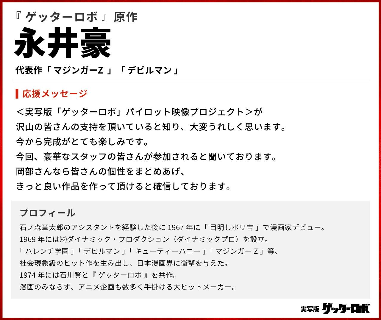 <実写版「ゲッターロボ」パイロット映像プロジェクト>が沢山の皆さんの支持を頂いていると知り、大変うれしく思います。今から完成がとても楽しみです。