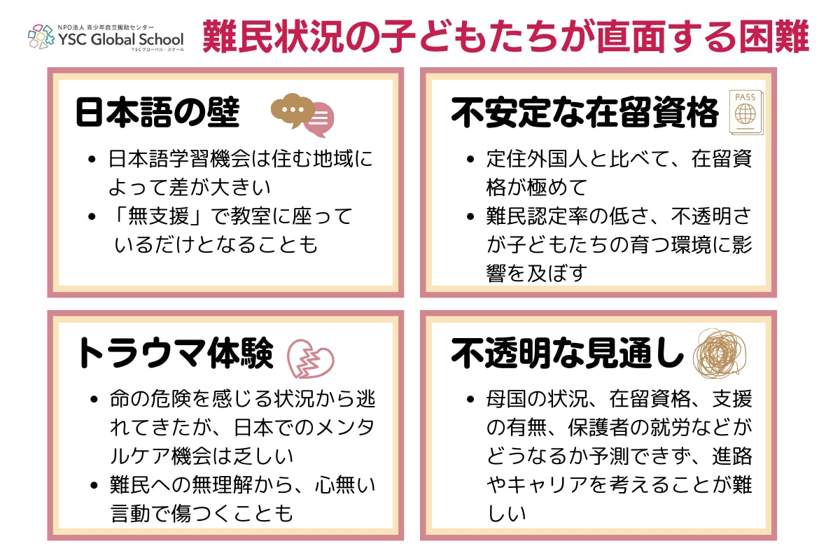 出身国での紛争や命の危険から逃れてきた子どもたちは、トラウマ(心的外傷)になる出来事を経験しています。日本国内で母語でのメンタルケアを受けられず、様々な不安や思いをなかなか吐き出せない状況です。また、難民や難民の状況についての理解が乏しい環境で、マイクロアグレッション(悪意のない差別的言動)やいじめにさらされることもあります。