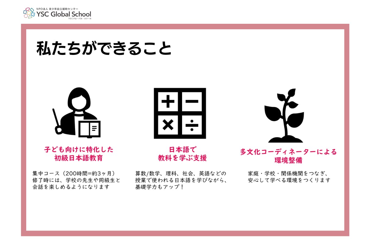 YSCグローバル・スクールを運営するNPO法人青少年自立援助センターは認定NPO法人ではありません。ご支援に伴う寄付金控除の対象とはなりませんので、あらかじめご了承ください。