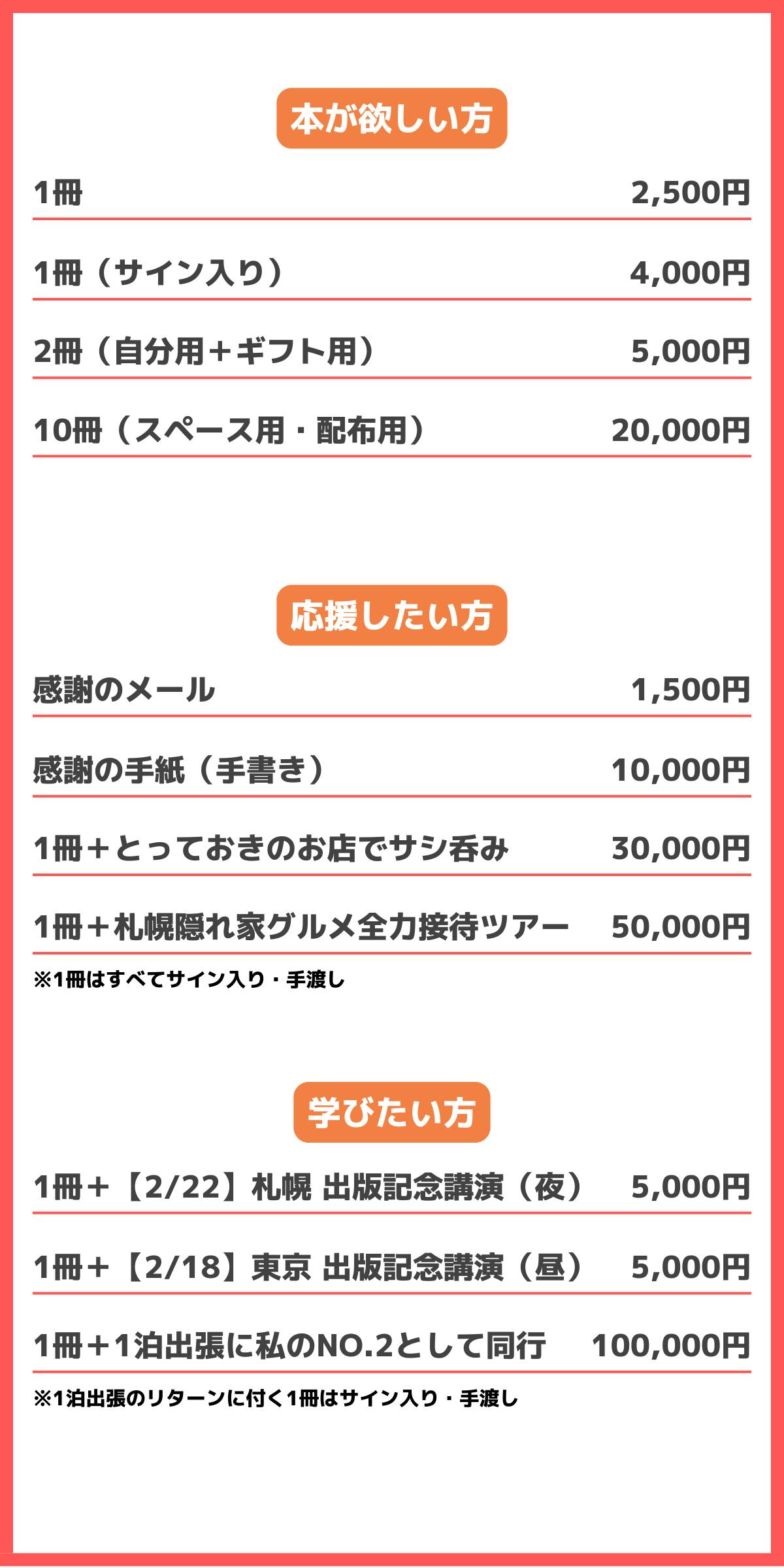 当プロジェクトのリターンと致しまして、完成した書籍をお届けする他、僕自身への個別相談やとっておきのお店でのお食事会、出版記念講演、出張同行権、組織創りを支援する人事顧問サービスなど多彩なリターンをご用意させて頂きました。