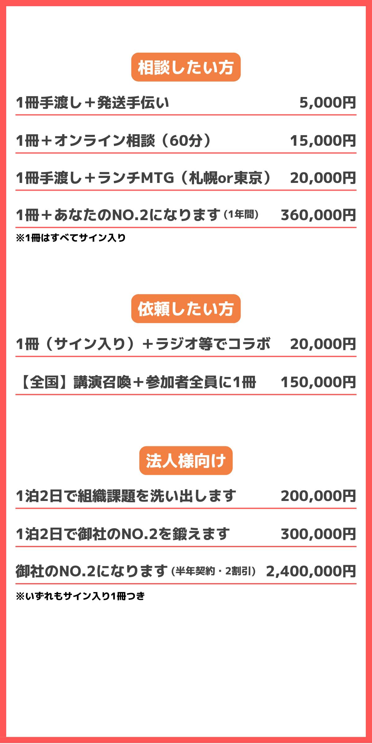 2024/02/16 20:33【出版記念イベントin札幌&東京 開催】1月29日月曜日に出版させて頂きました著書『No.2じゃダメですか?』の出版記念イベントを東京と札幌にて開催することになりました!当日は私自身の「支える個性」に至ったルーツから本書の執筆に至るまでの経緯・私が考える理想のNo.2像についての講演を前半に、後半は参加者の皆さんとの交流会という構成になっております。なお、東京会場はクラファンリターン購入者の方限定ですが、札幌会場は私が事務局長を務めさせて頂いております地域コミュニティ「えぞ財団」の主催にて、どなたでもオープン参加できます!こちらの札幌会場では著者講演の後にえぞ財団代表理事の富山さん、本書籍の出版元である逆旅出版代表中馬さりのさんと共に出版裏話や今年えぞ財団で進める新プロジェクトの話も交えてのトークセッションもお届けいたします!《東京会場》●日時:2024年2月18日13:30-15:00●場所:都内某所(リターン購入者の方に個別にお知らせ)《オープン参加可能/札幌会場》●日時:2024年2月22日(No.2の日?!)18:30-20:00●場所:EZOHUB SAPPORO (札幌市東区北8条東4丁目1−20 2階)●参加費:無料▼札幌イベント参加予約はこちらからhttps://fb.me/e/1PpD1OQM6「支える個性」の活かし方やNo.2人材活用についてはもちろん、書籍出版にご興味がある方もぜひ遊びに来て下さいね!会場でお会いできることを楽しみにしております! もっと見る【達成の御礼】無事目標を達成することができました!ありがとうございました!!